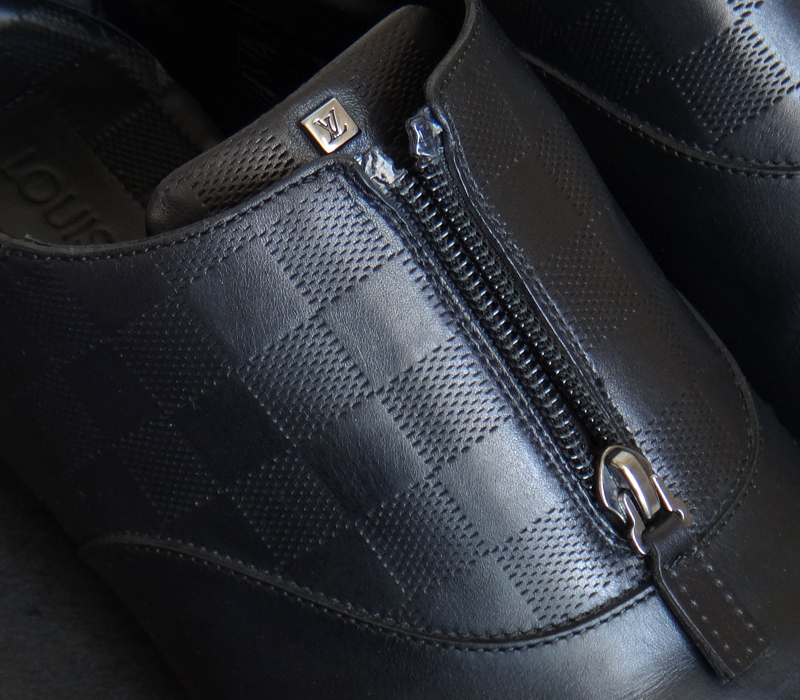 Полностью кожаные. Тиснение шашки Damier Infini. Стелька внутри тоже красивая, с тисненой шашкой. Спереди вместо шнурков молния. Сделаны в Италии.