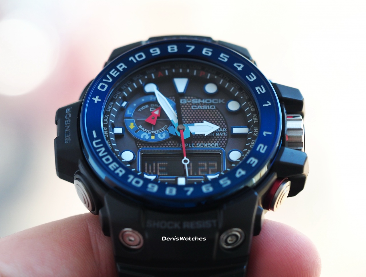 Это первая модель из серии G-Shock, у которой есть комбинированный дисплей и тройной сенсор, т.е. присутствуют барометр, термометр и компас.