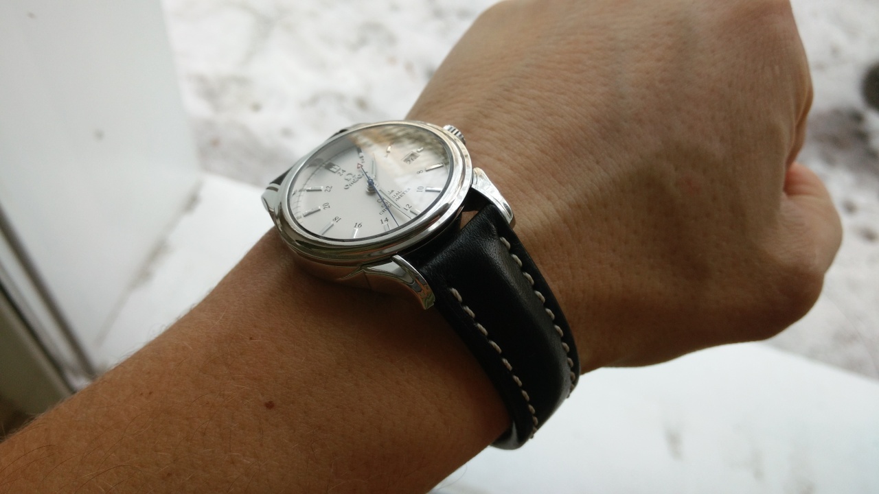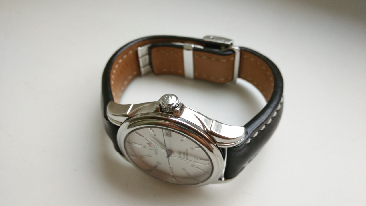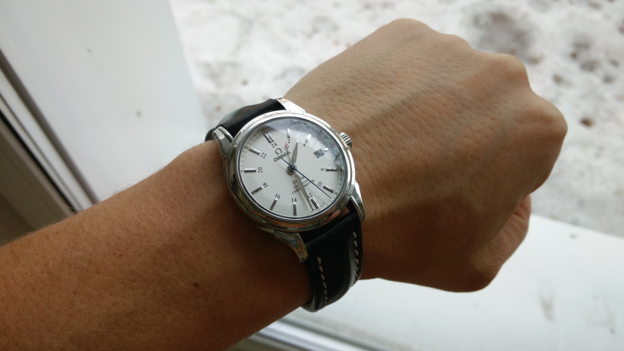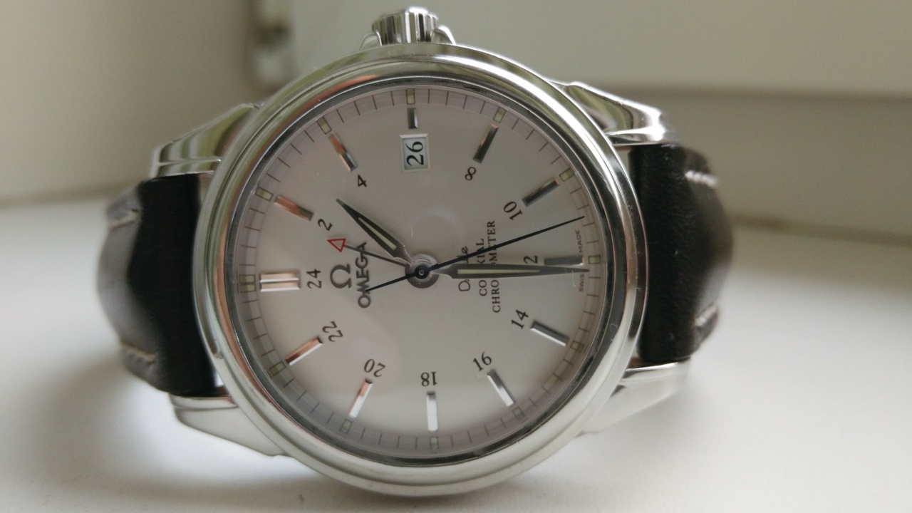 Продаю одни из своих самых любимых и универсальных часов. Состояние прекрасное. Ремень неоригинальный Rios с раскладывающейся клипсой, он мне нравится даже больше чем оригинальный, он толще и гораздо лучше подходит этим часам. В отличии от серии DeVille Prestige мои часы не являются 100% костюмниками, они будут прекрасно смотреться как с джинсами, так и с шортами. Замечательный молочный цвет циферблата прекрасно сочетается как раз с костюмами и легко комбинируется с разного цвета ремнями. Ещё, на мой взгляд, у них самый красивый шрифт надписей и цифр даты, нигде такого красивого не встречал однозначно. Скажу сразу: эти часы намного удобней на руке чем AquaTerra за счёт более обтекаемой и удобной, здесь красивей стрелки, есть замечательная стрелка GMT и тонкая, как волос, секундная стрелка. Метки и логотип полированные и накладные, а не рисованные, как на многих других Омегах. И моё мнение, что эти часы, самые универсальные из всех Omega, они смотрятся с джинсами и свитером на порядок лучше, чем, например, Seamaster с костюмами. Утверждаю это, так как имею в наличие почти все серии часов Omega и несколько Breitling. Водонепроницаемость часов 100 метров, можно не бояться попадания влаги внутрь корпуса. Размер 39мм, идеален для запястья от 16 до 18мм, толщина всего 10мм, влезают под любой манжет рубашки, даже под достаточно узкий. В сравнении с часами 40-41мм маленькими совсем не кажутся, а, например, если сравнить с Breitling Chronomat 39mm выглядят гораздо больше, кстати как и в сравнении в Planet Ocean 42mm, так как нет широкого безеля и площадь стекла гораздо больше. Из комплекта есть только коробка без подушки. Проверить можно в любом сервисе. Кстати ход +-2 сек. в сутки, что очень достойный показатель для хронометра. Особой задачи продать во что бы то не стало не преследую, причина продажи: есть очень много хороших и разных часов и от каких-то можно отказаться. Искушать меня фразами типа: "Куплю сегодня за 70 тысяч" не надо. Таких часов, в таком как у меня состоянии, дешевле моей цены нет. Торг чисто символический и только при осмотре реальному покупателю. По соотношению "престиж марки + характеристики + узнаваемость" за такие деньги ничего лучше не найти, проверено мной не раз. Не продадутся, оставлю себе, так как расставаться с часами откровенно жаль. Если продадутся, точно буду по ним скучать. Сейчас часы на ремне (чёрный с белой строчкой) с ним и продаются.