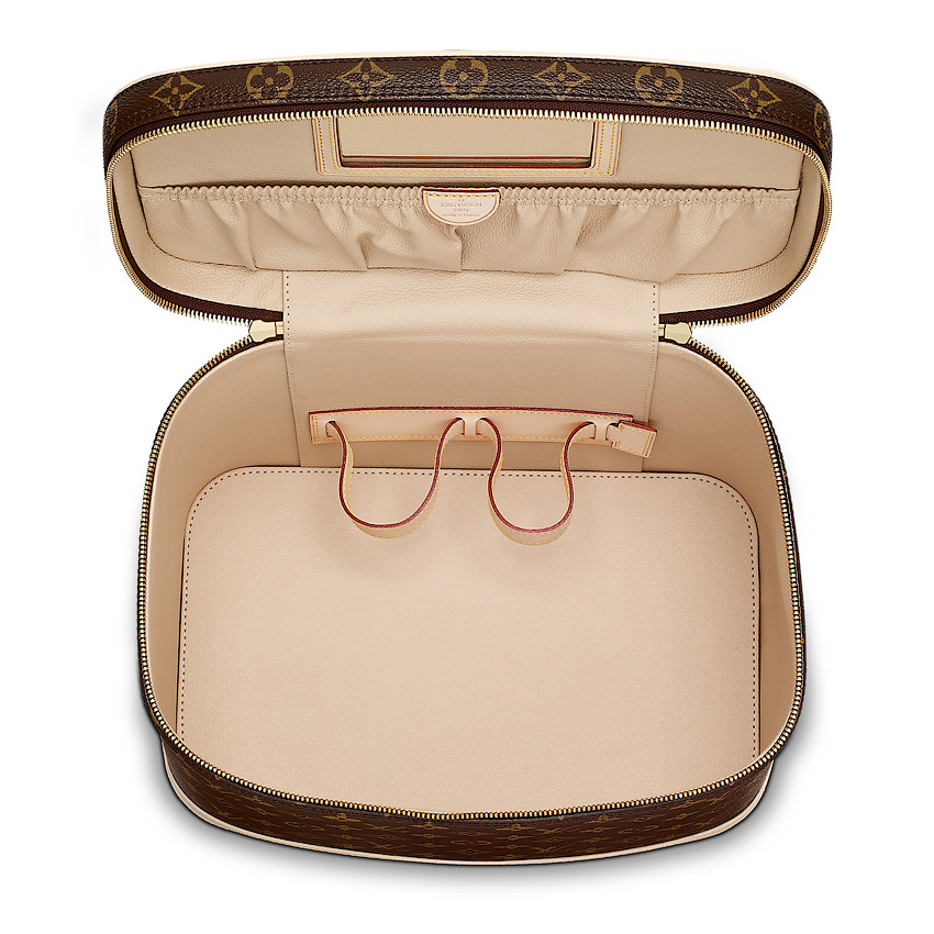 "Этот элегантный бьюти-кейс из канвы Monogram закрывается на молнию. Предназначенная для ношения на плече или в руках модель оснащена зеркалом, карманом на молнии и креплениями для флаконов."