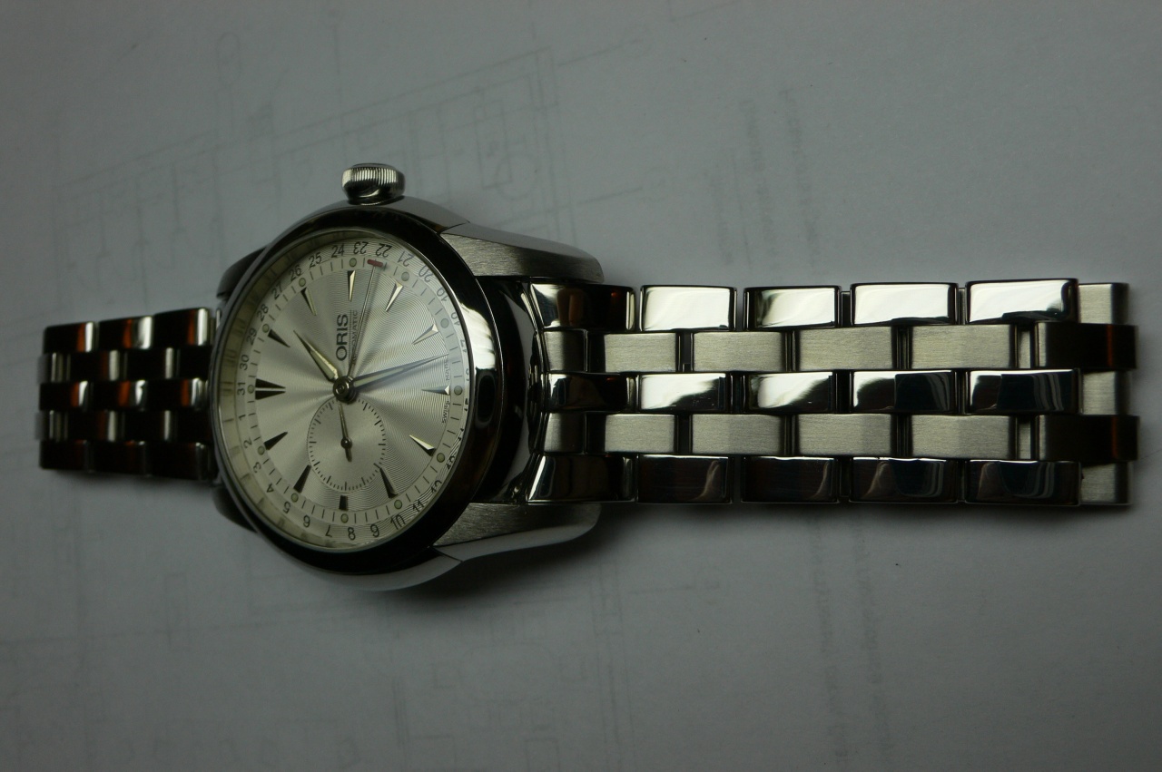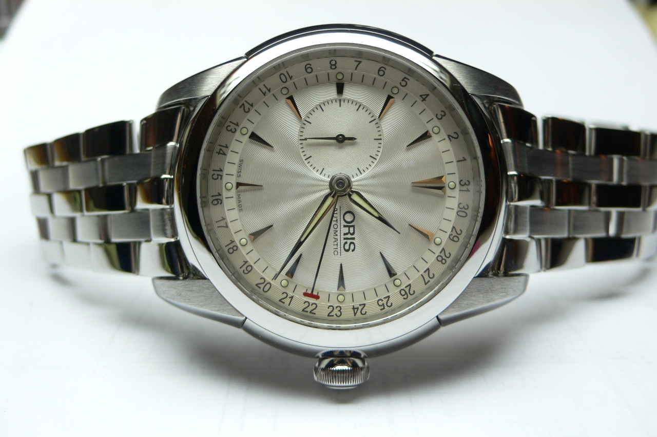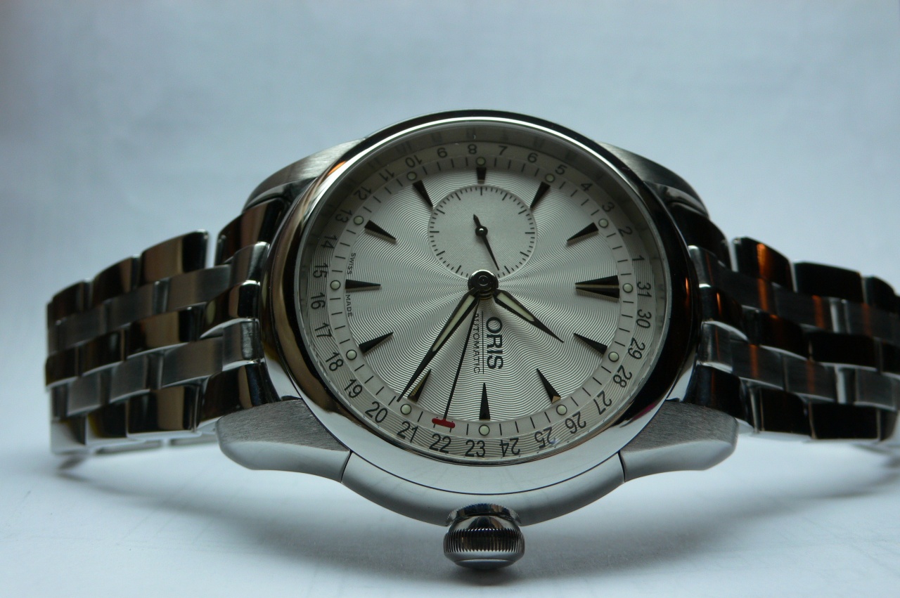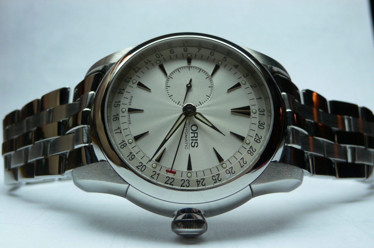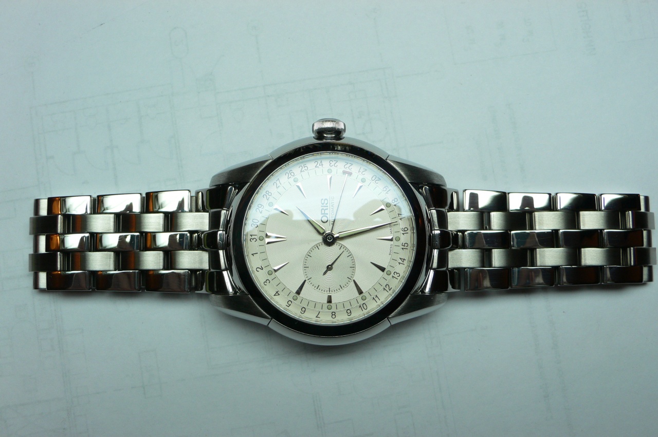 Модель Oris Pointer Date в своё время стала ключевым событием - а это ещё один механизм высокой механики pointer calеndar, помещённый в корпус Artelier, состоящий из 3 частей. Не обошлось, правда, и без характерных признаков: выгнутого сапфирового стекла с антибликом, циферблата с элегантны рисунком и, в добавок, металлический браслет.