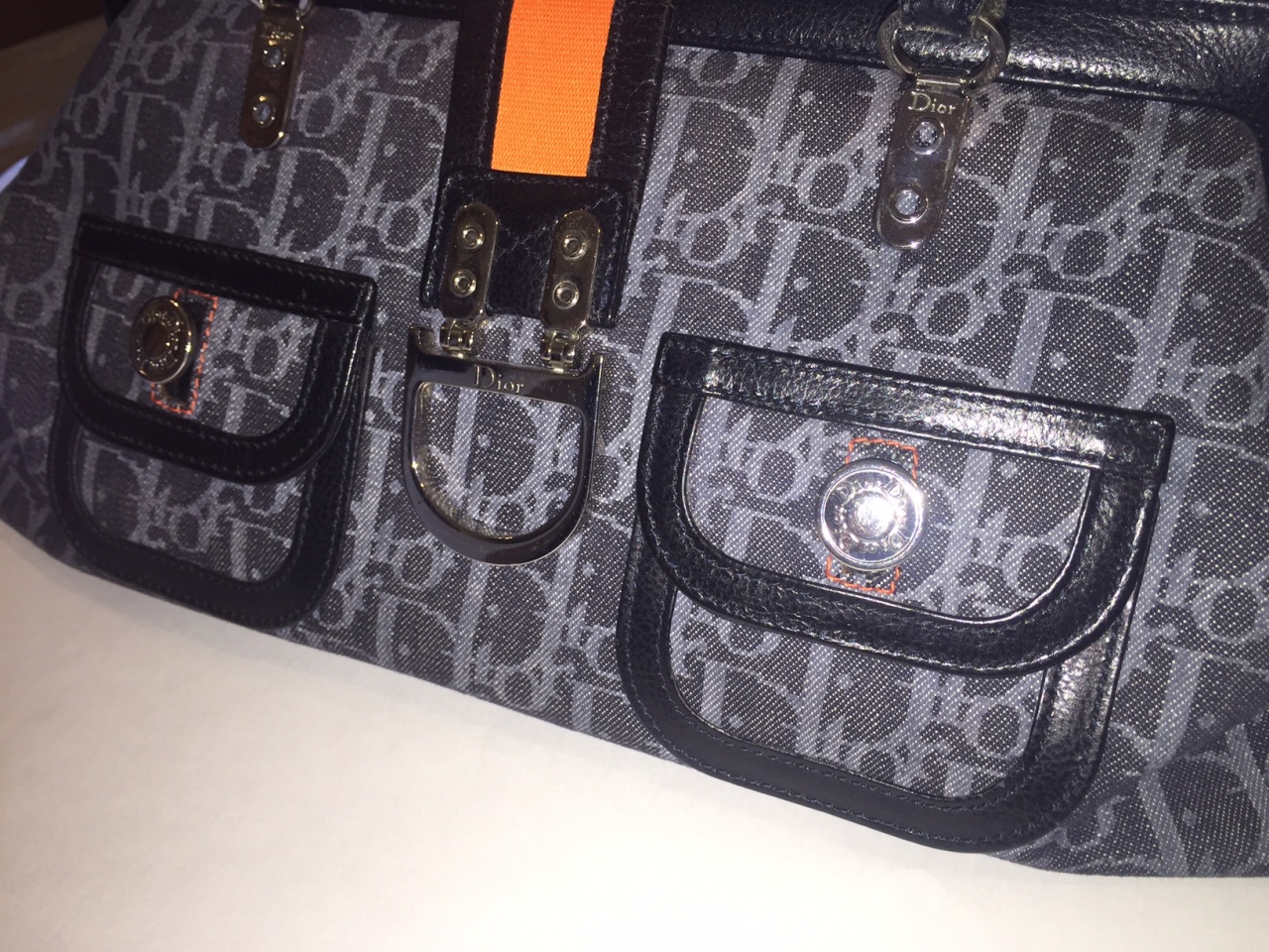 Харизматичная деталь внешнего вида сумочки - откидной клапан-ремень, черного с апельсиновым цвета, с декоративной пряжкой в виде буквы D с гравировкой логотипа Dior.