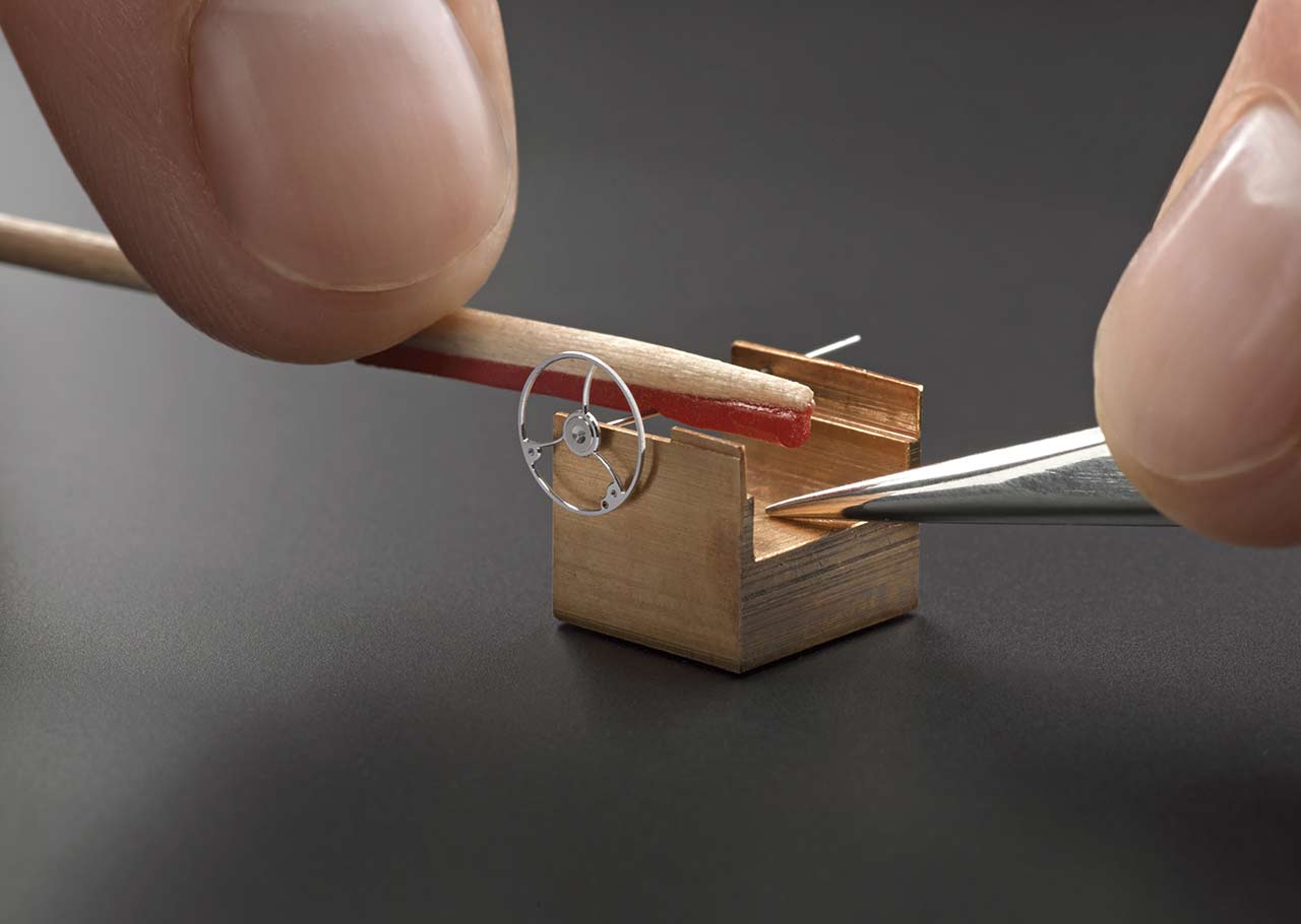 При помощи миниатюрной фрезы, разработанной в Lange специально для этой операции, часовщик прорезает обод баланса в том месте, где в нем просверлено отверстие. В дальнейшем, когда в отверстия с нарезанной в них резьбой будут ввинчены регулировочные винты, такие прорези слегка расширятся и прочно зафиксируют винты. Винты используются для уравновешивания баланса, поэтому очень важно, чтобы они сохраняли свое положение относительно обода баланса, не разбалтываясь за все время использования часов. Чтобы фреза не перегревалась, мастер охлаждает ее кисточкой, смоченной этиловым спиртом.