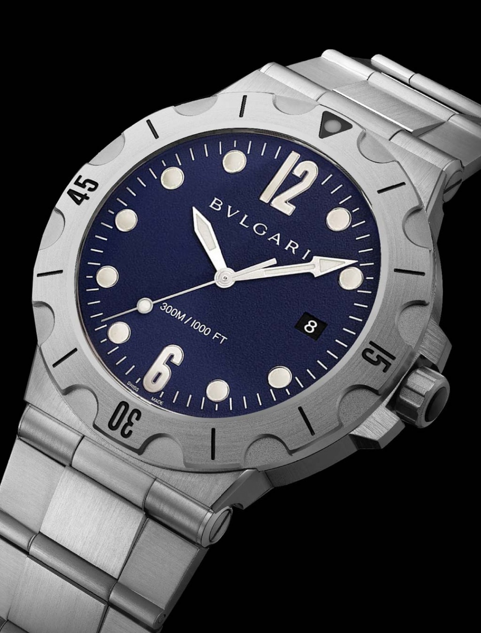 Круглый корпус диаметром 41,0 мм, водонепроницаемый до 300 метров. Защищенная завинчивающаяся рифленая заводная головка расположена на 3 часах. Вращающийся однонаправленный дайверский безель, выполненный в зубчатой форме. Сапфировое стекло защищает циферблат с арабскими цифрами, круглыми часовыми индексами, покрытыми, как и стрелки, люминесцентным составом SuperLumiNova белого цвета. Модель оснащена мануфактурным швейцарским автоматическим механизмом Bvlgari BVL191, с балансовой частотой 28800 полуколебаний в час (4 гц), 42-часовым запасом хода, функциями индикации часов, минут, секунд (посредством соответствующих центральных стрелок) и даты (посредством соответствующего цифрового указателя в прямоугольной апертуре, расположенной на 3 часах).