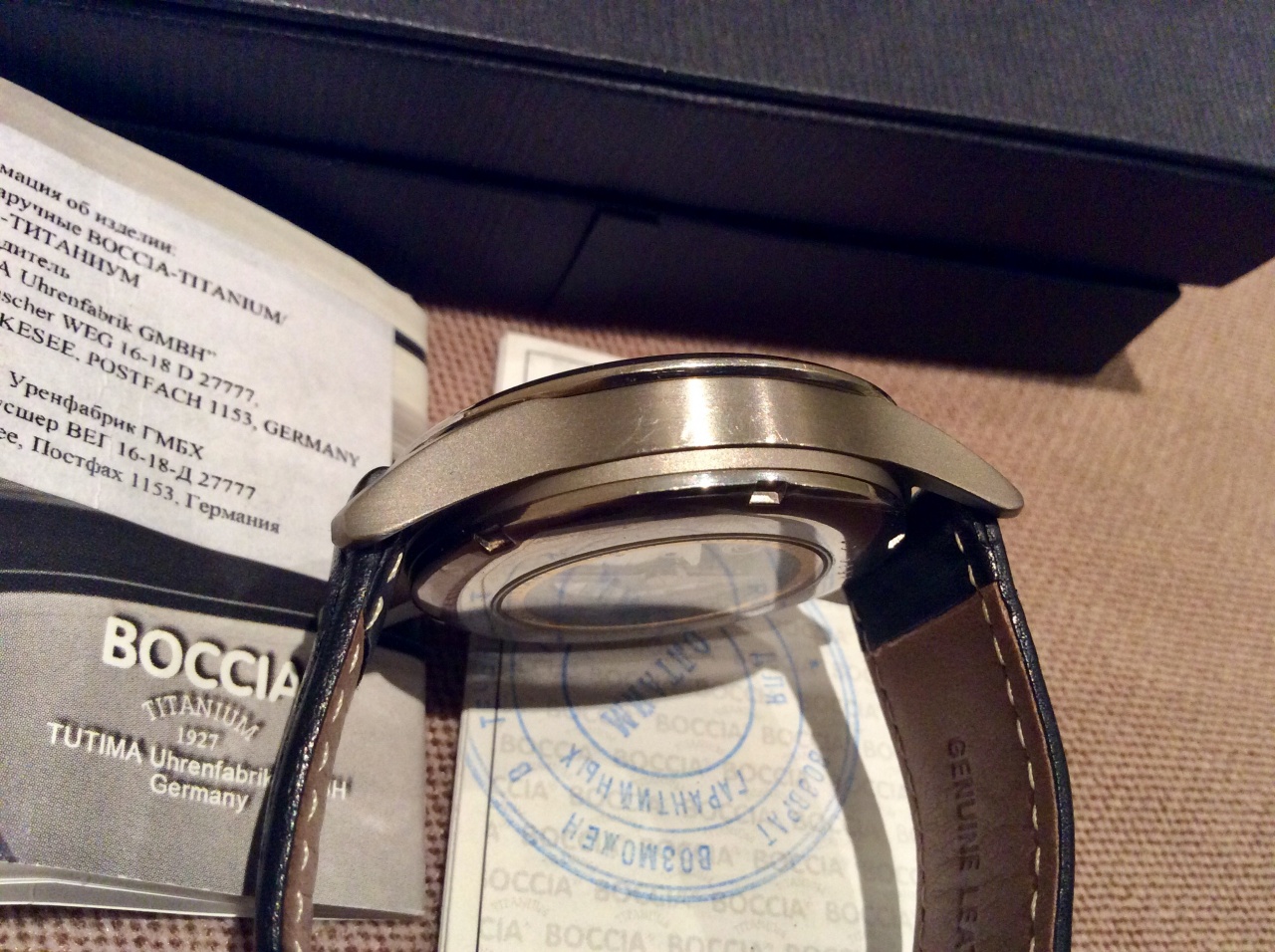 Здравствуйте! Продам замечательные титановые немецкие часы с открытым балансом и прозрачным задним стеклом. Диаметр часов 41 мм - на среднюю или крупную руку. Покупались в конце 2014, получил их в 2015, т.к. часы побывали в гарантийном ремонте в связи с тем, что сразу после покупки спешили. После ремонта они начали идти отлично и до сих пор точно идут.Оба стекла минеральные. Присутствует как автоподзавод, так и подзавод от руки. Механизм декорирован женевскими волнами.Несмотря на массивный внешний вид часы очень лёгкие, т.к. корпус выполнен из титана.Циферблат гильоширован вертикальными линиями. Часы имеют довольно универсальный дизайн. Коробка и все документы на месте