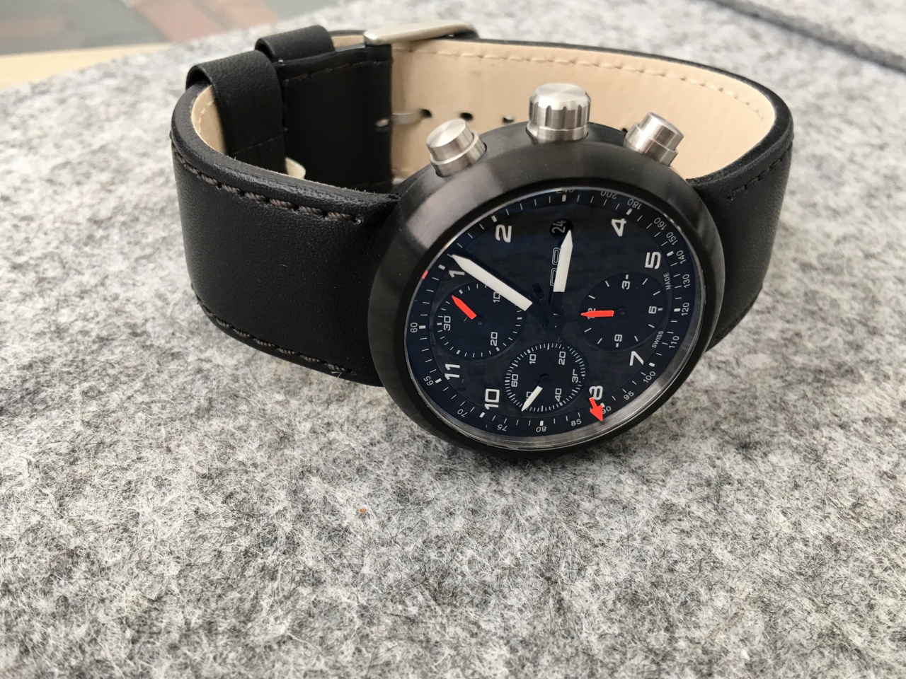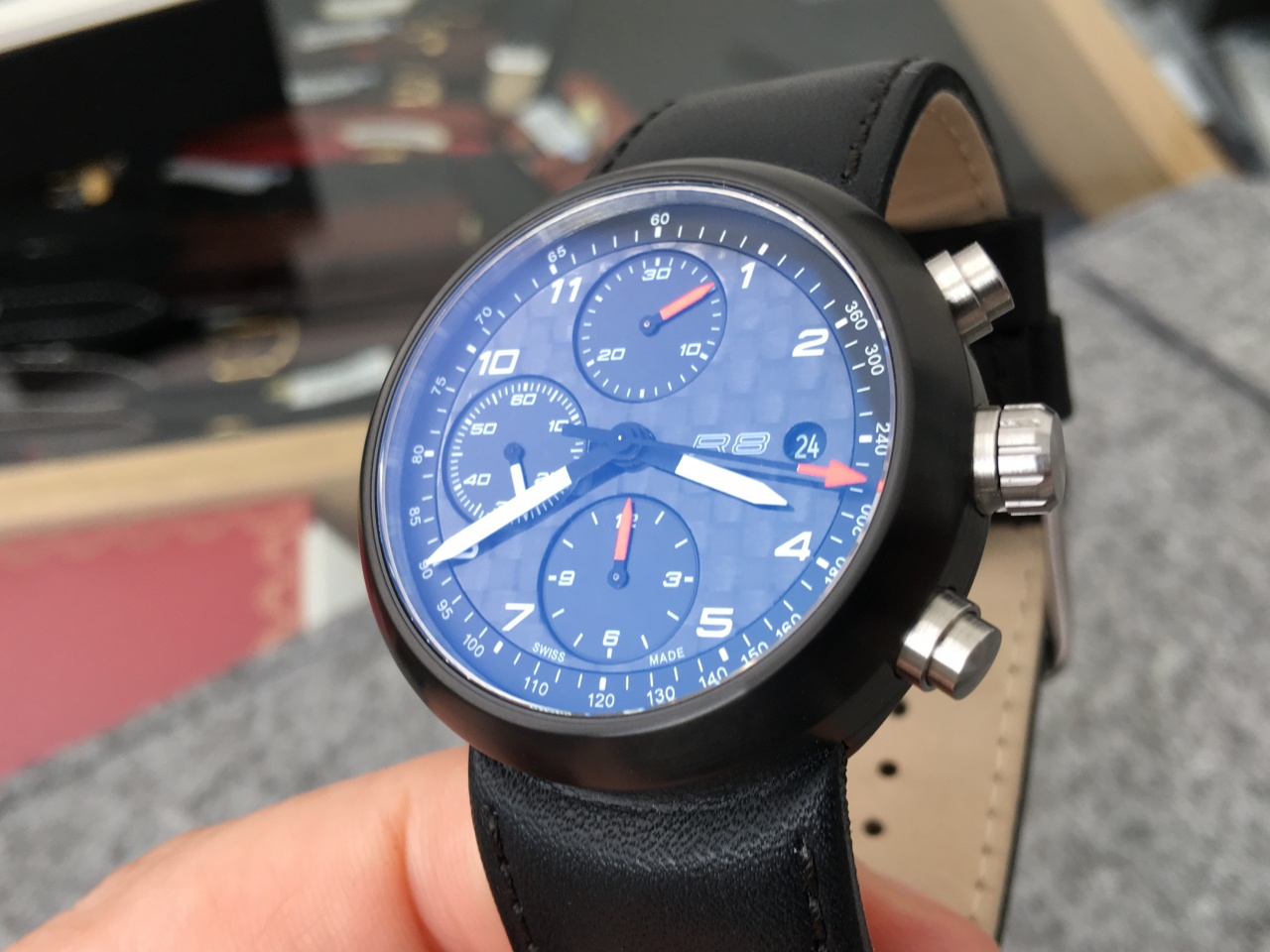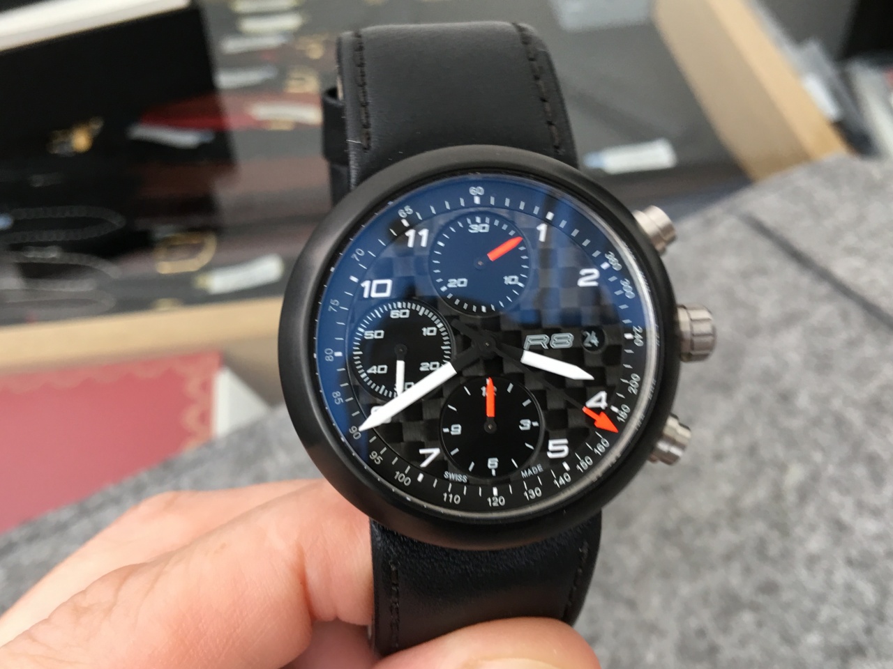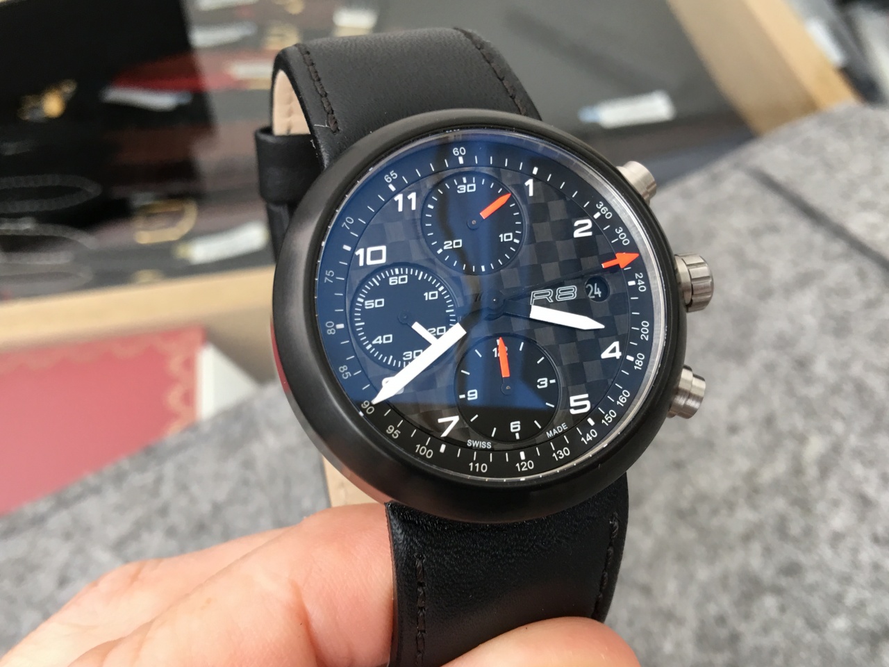 Cходство этого хронографа со спидометром автомобиля R8 не является случайным. Высококачественный корпус изготовлен из черненой благородной стали, а Циферблат — из натурального карбона.