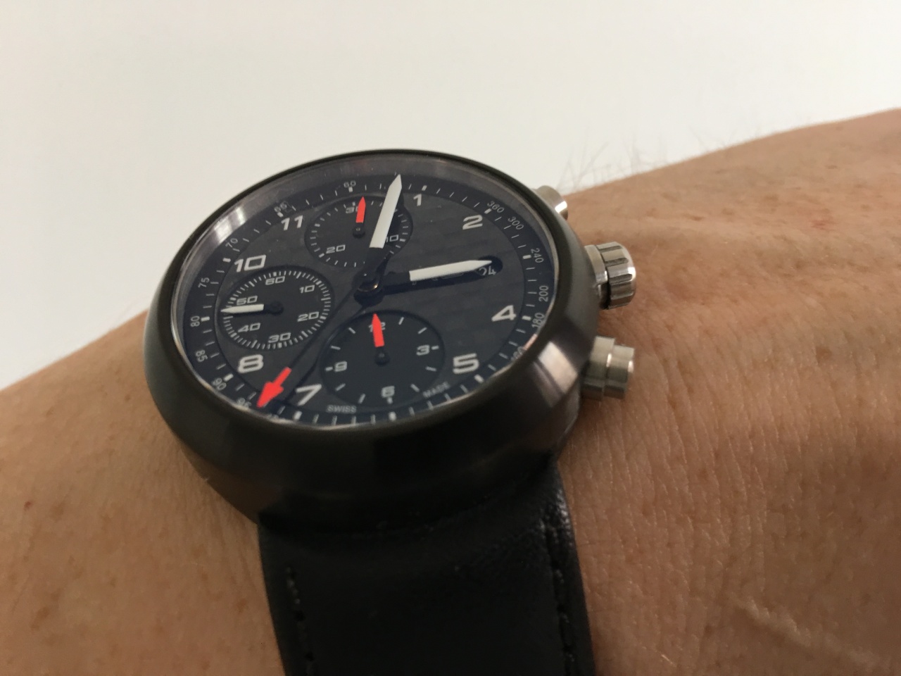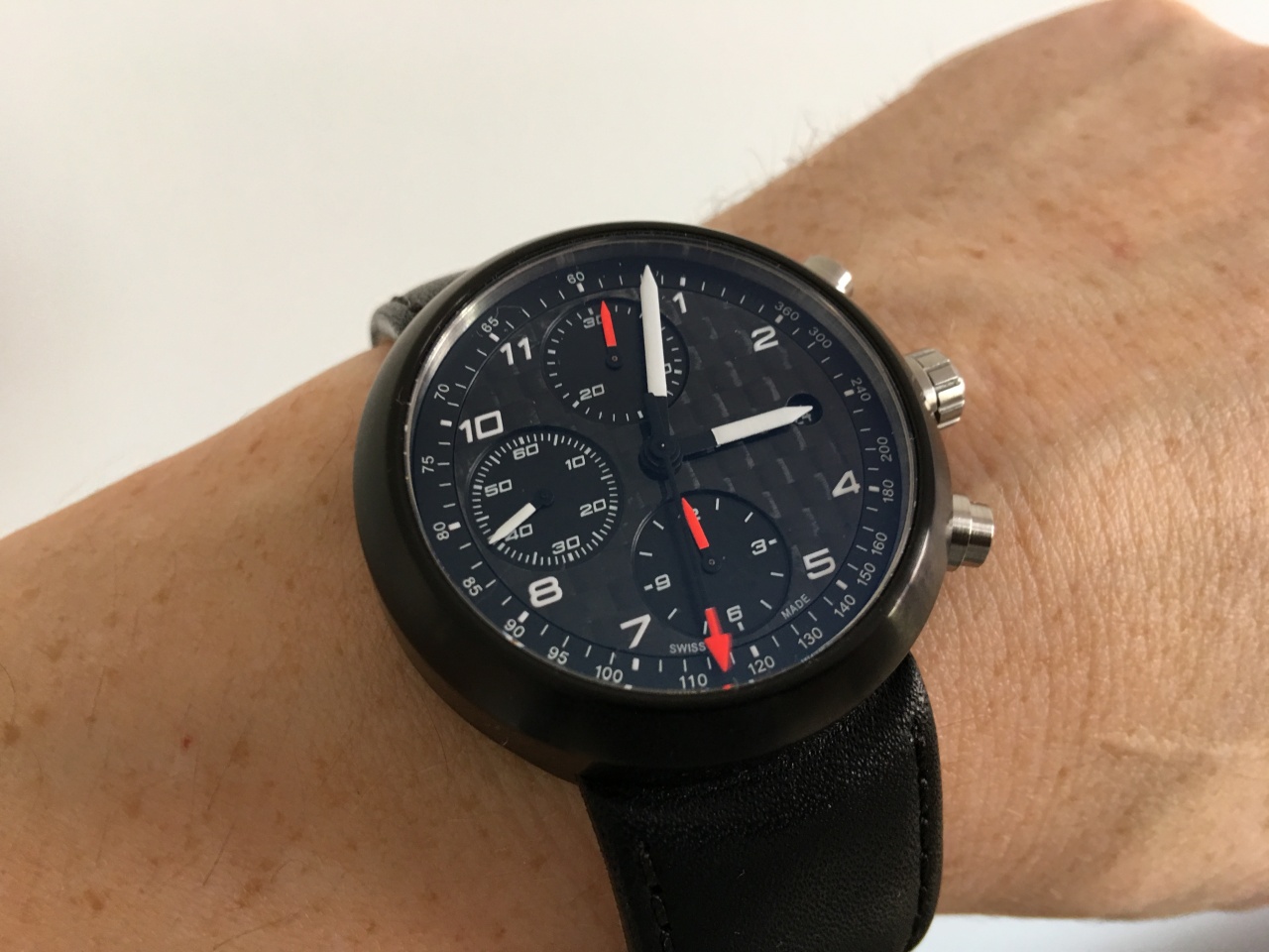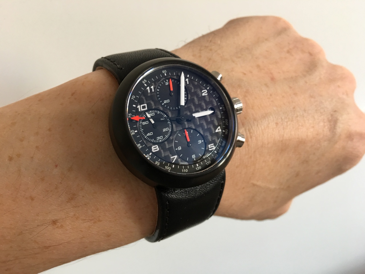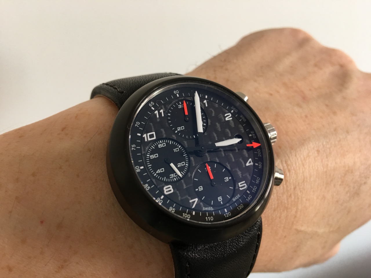 Cходство этого хронографа со спидометром автомобиля R8 не является случайным. Высококачественный корпус изготовлен из черненой благородной стали, а Циферблат — из натурального карбона.