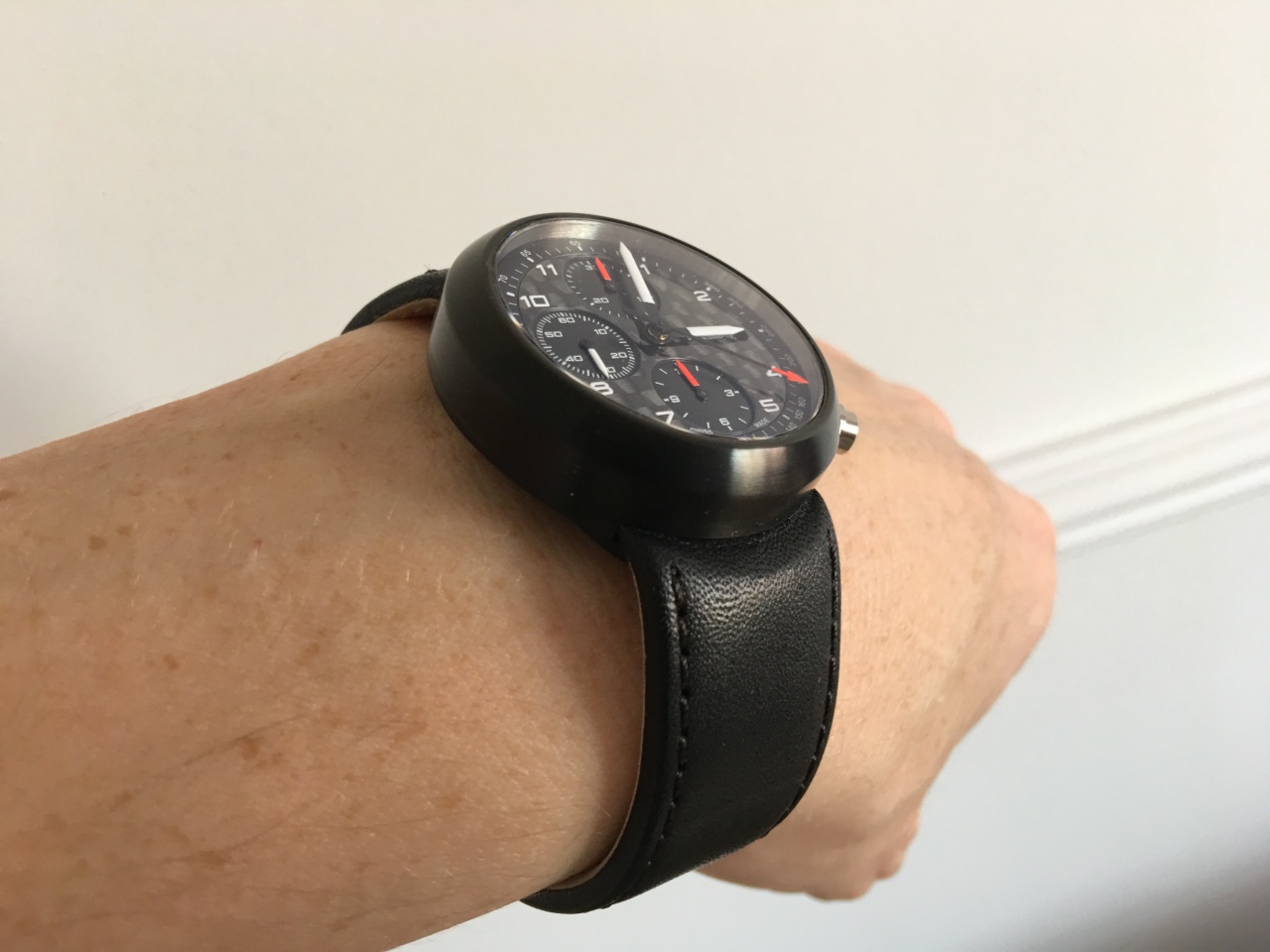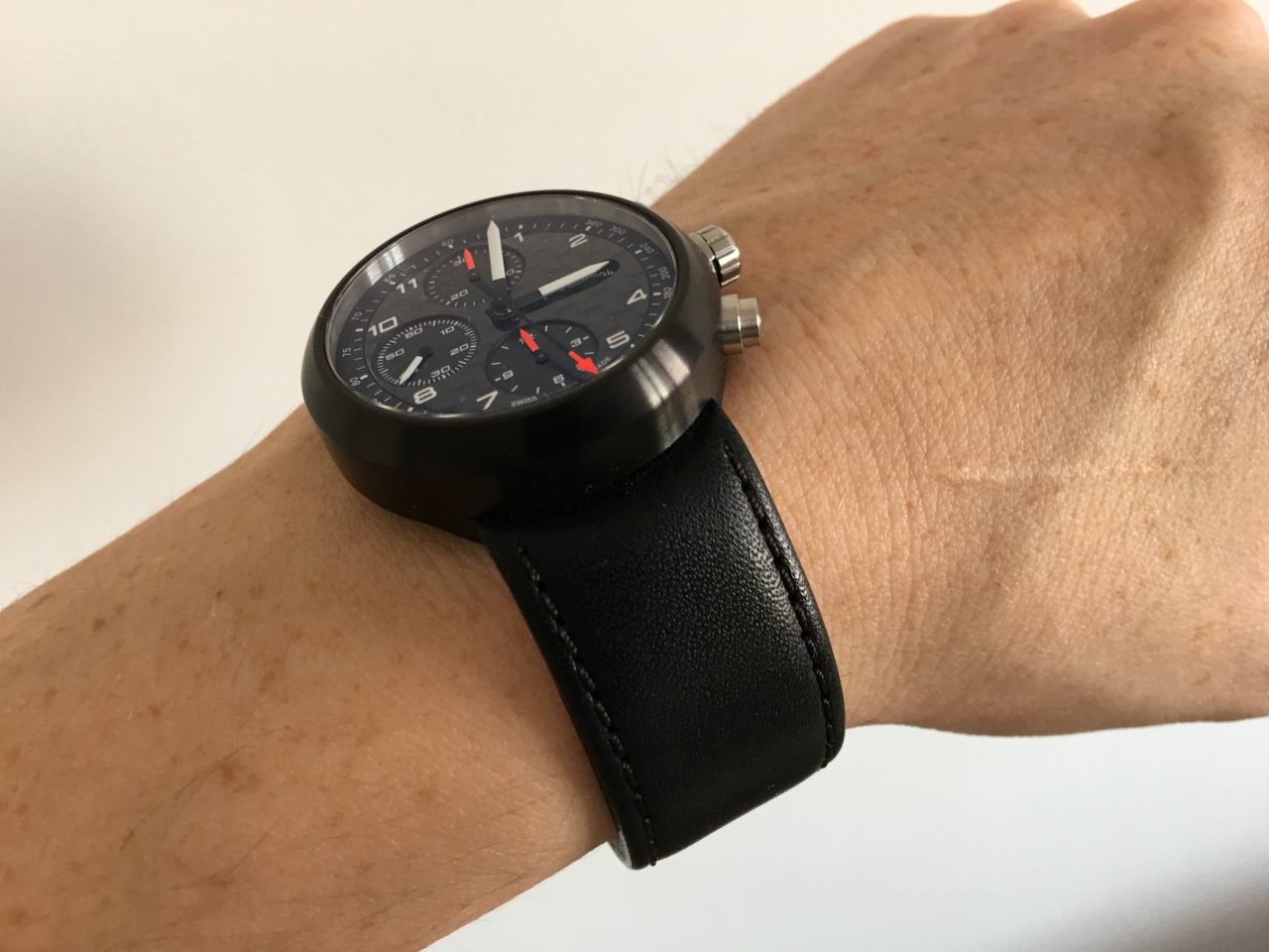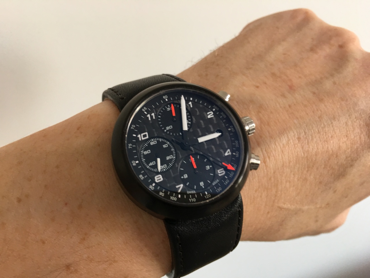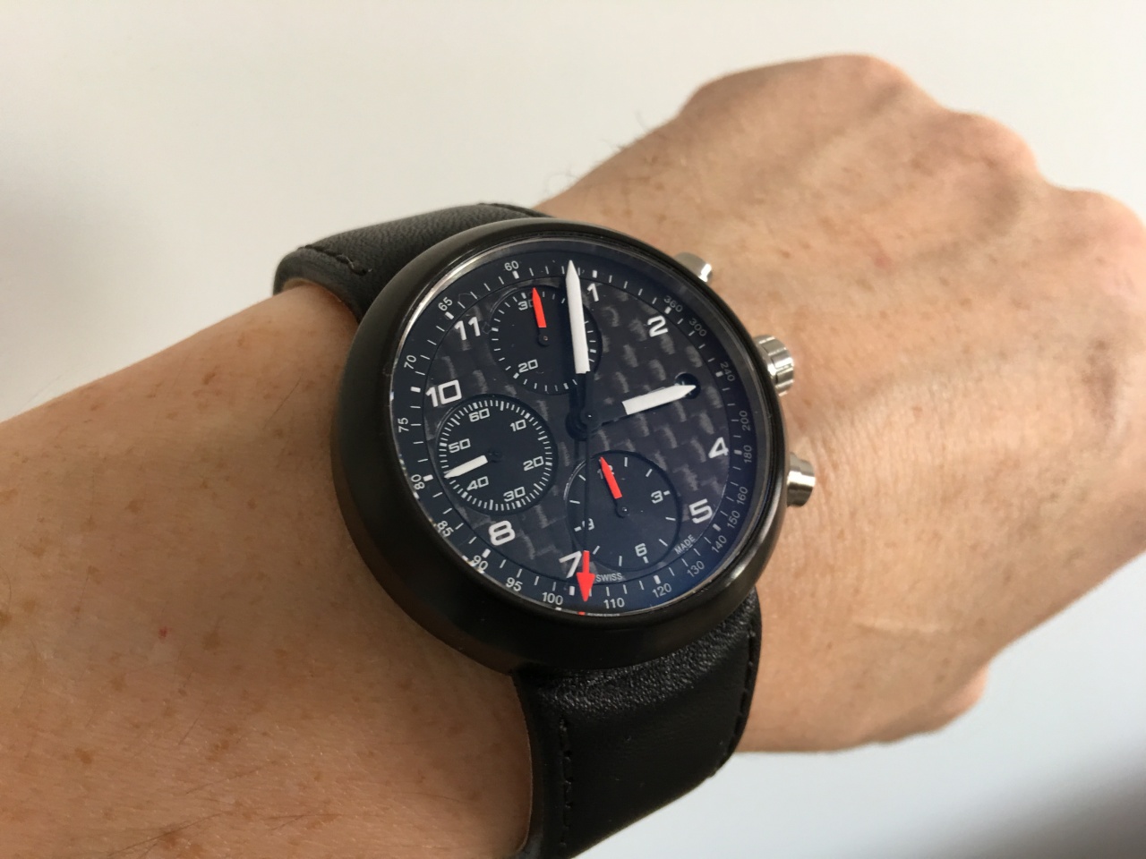 Cходство этого хронографа со спидометром автомобиля R8 не является случайным. Высококачественный корпус изготовлен из черненой благородной стали, а Циферблат — из натурального карбона.