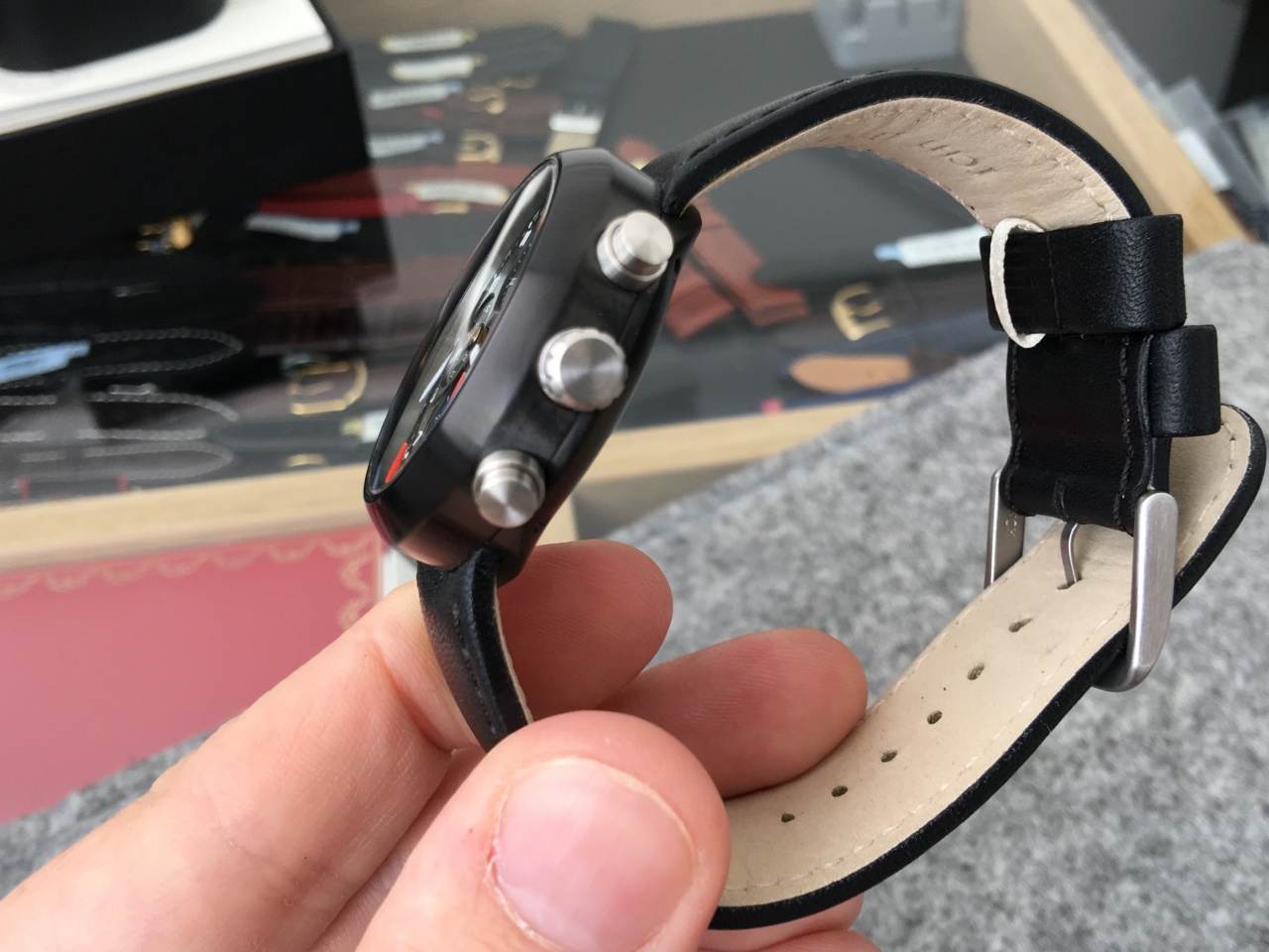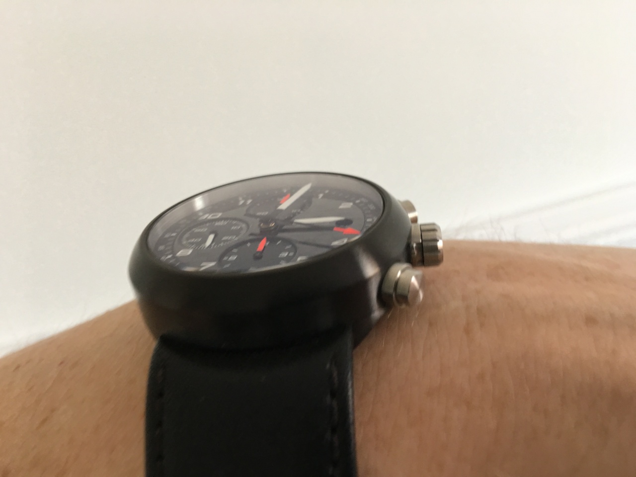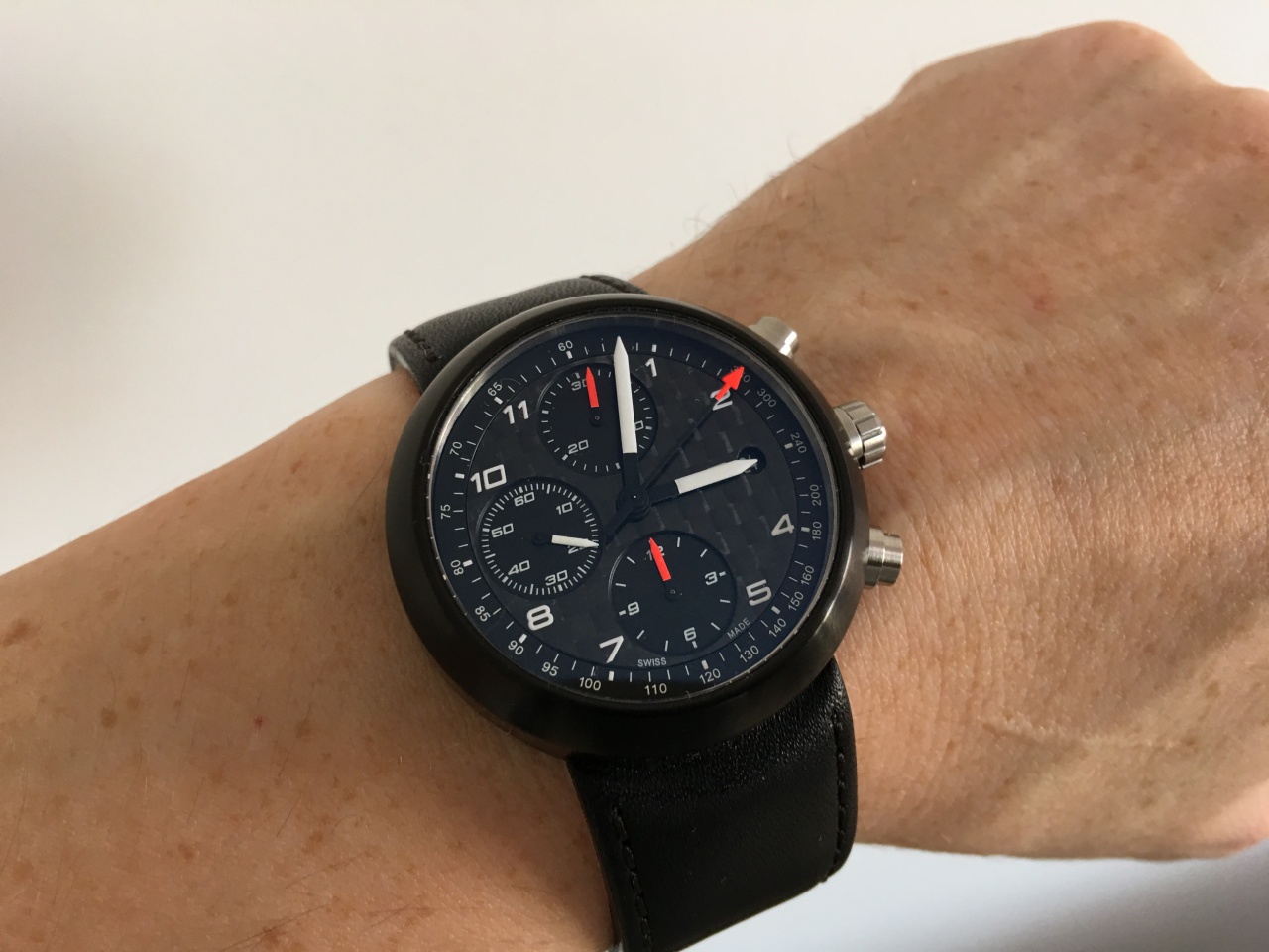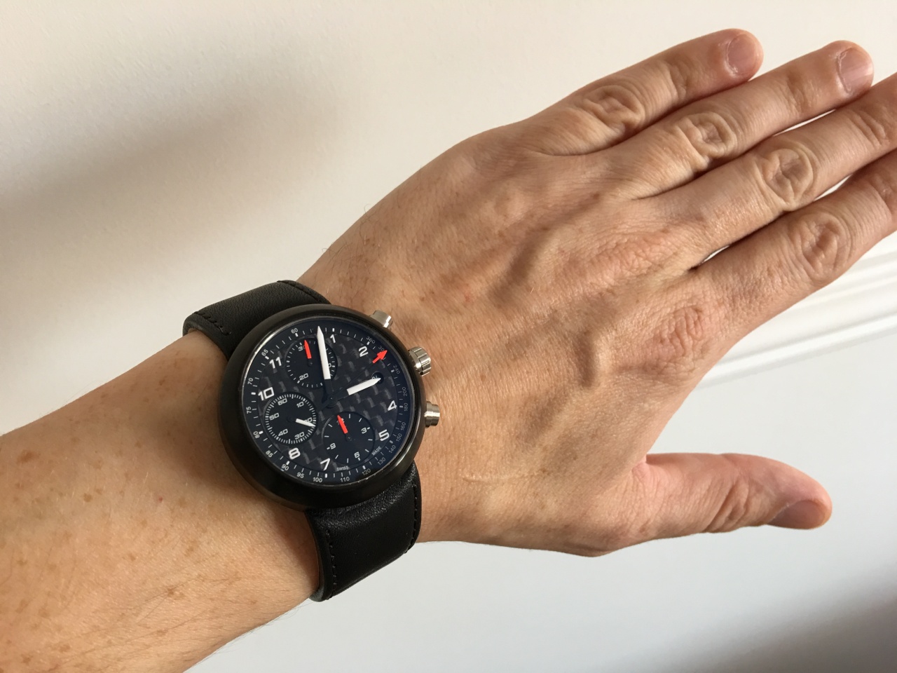 Cходство этого хронографа со спидометром автомобиля R8 не является случайным. Высококачественный корпус изготовлен из черненой благородной стали, а Циферблат — из натурального карбона.