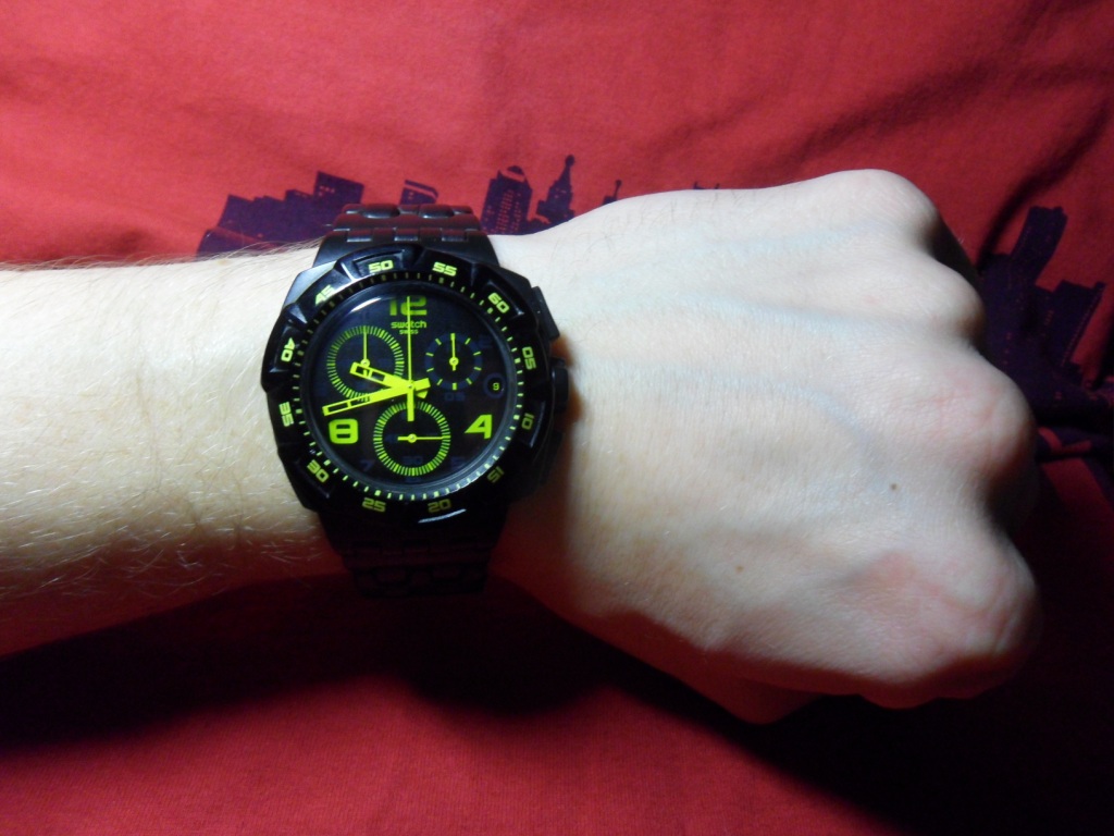 Итак, конкретно мои часы это хронограф. Секундная стрелка внизу. Очень интересно то, что все стрелки попадают в метки. Сегодня был в магазине, рассматривал разные модели. Так вот, на ВСЕХ часах секунда попадает в метки. Едем дальше. Точность. Swatch на мое удивление оказались самыми точными из всех моих часов! За три месяца (замерял еще летом) они шли тупо в ноль! Такое не показывают даже цифровые (без синхры) Casio.