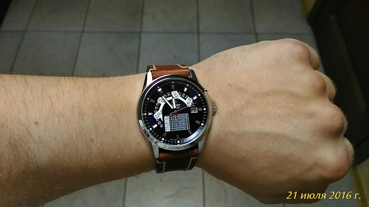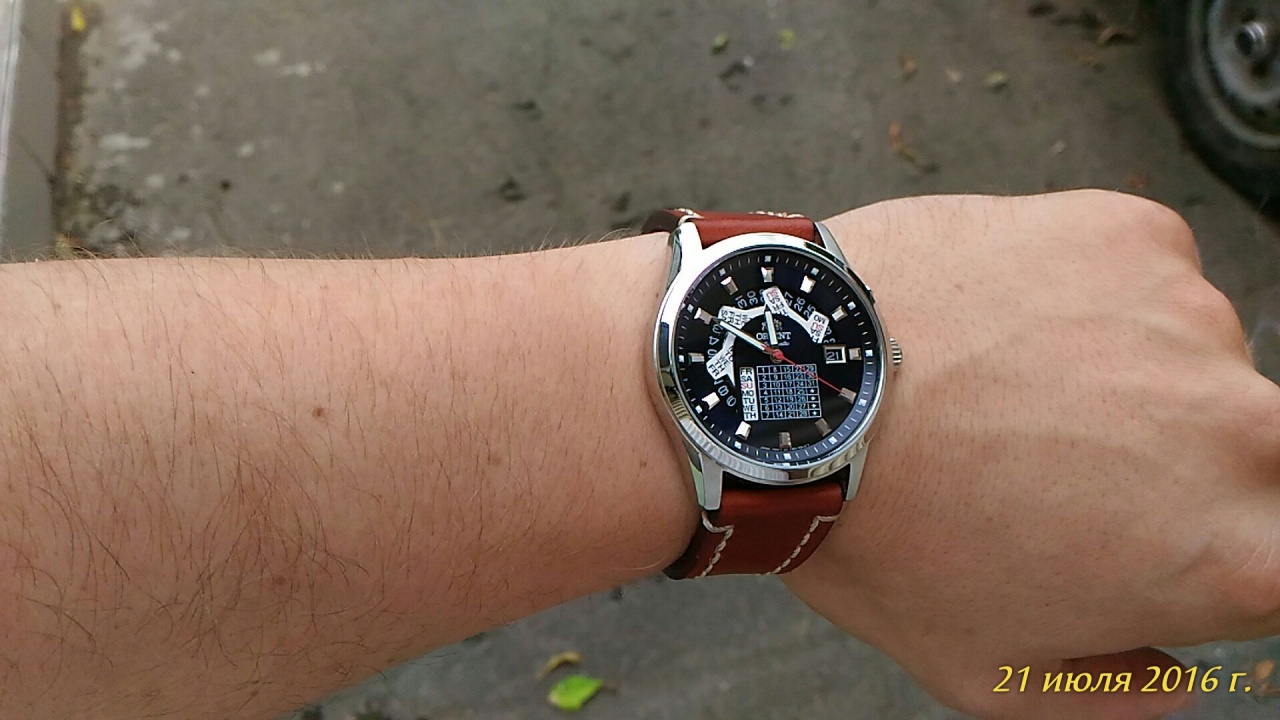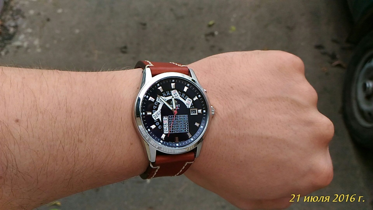 Ниже прилагаю фото часов на браслете и на своем коньячном хирше, для наглядности.