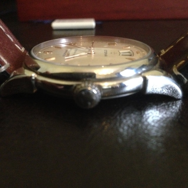 Циферблат: серебристый циферблат c золотыми накладными арабскими цифрами и метками с покрытием составом Superluminova