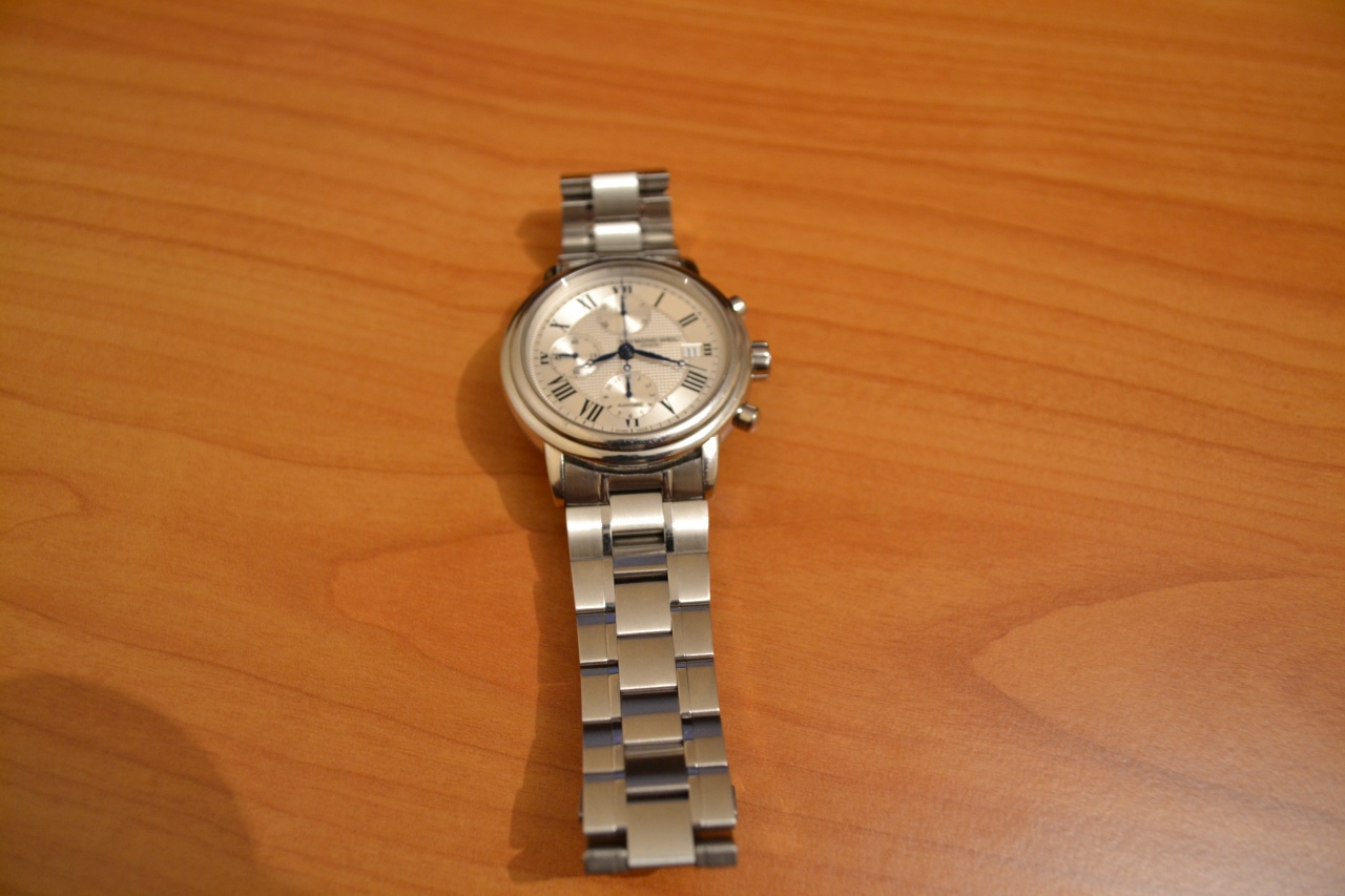 Механический хронограф с секундомером и автоподзаводом, запас хода 46 часов. Индикация числа. Сапфировое стекло с антибликовым покрытием. Кожаный ремешок. Диаметр корпуса 41,5 мм.