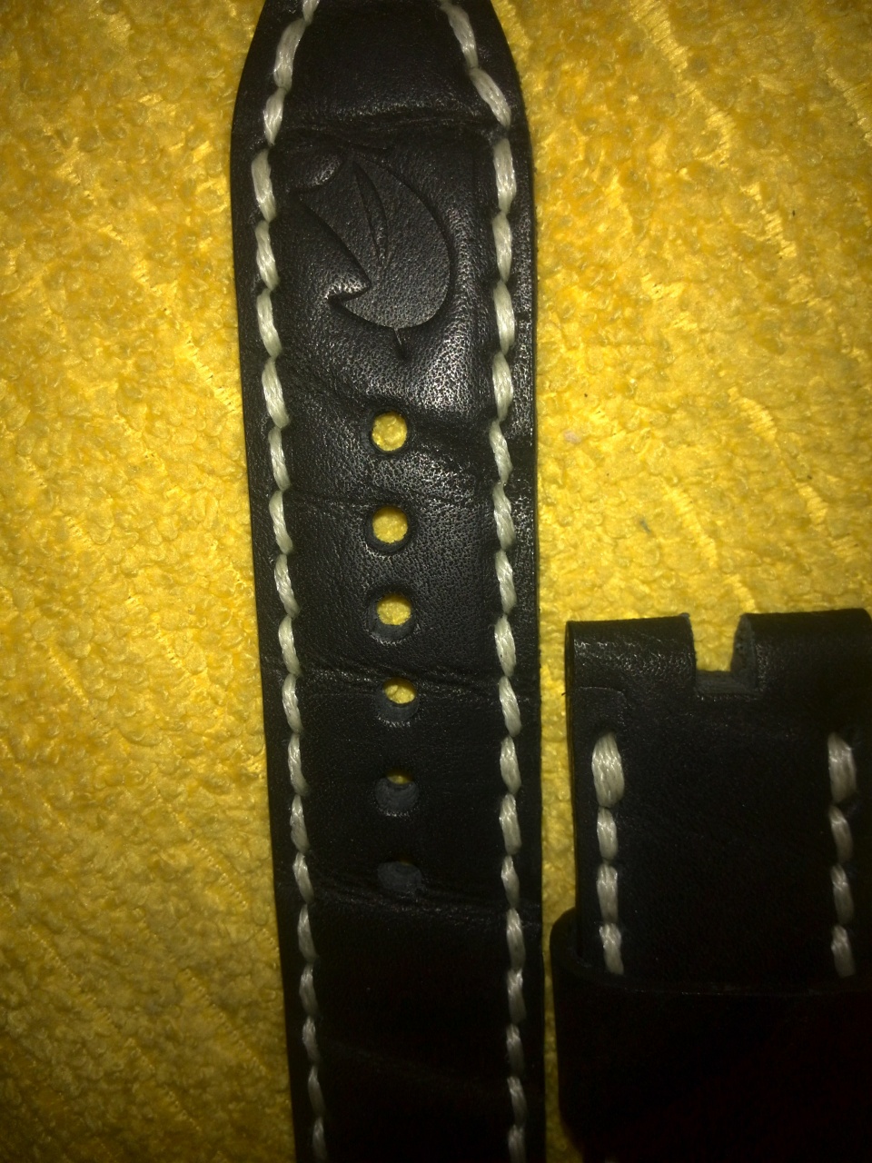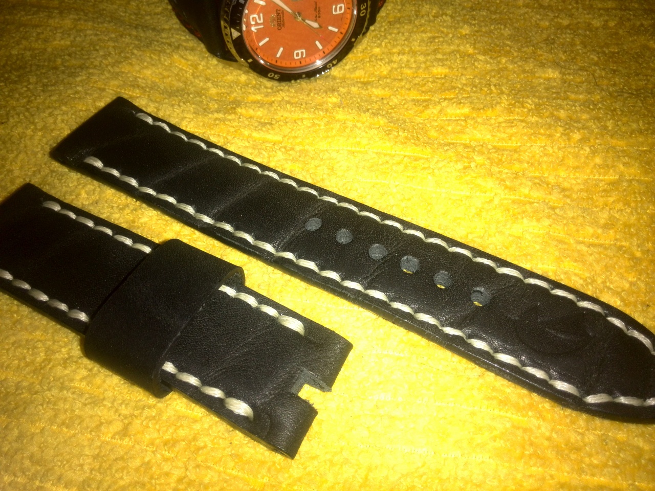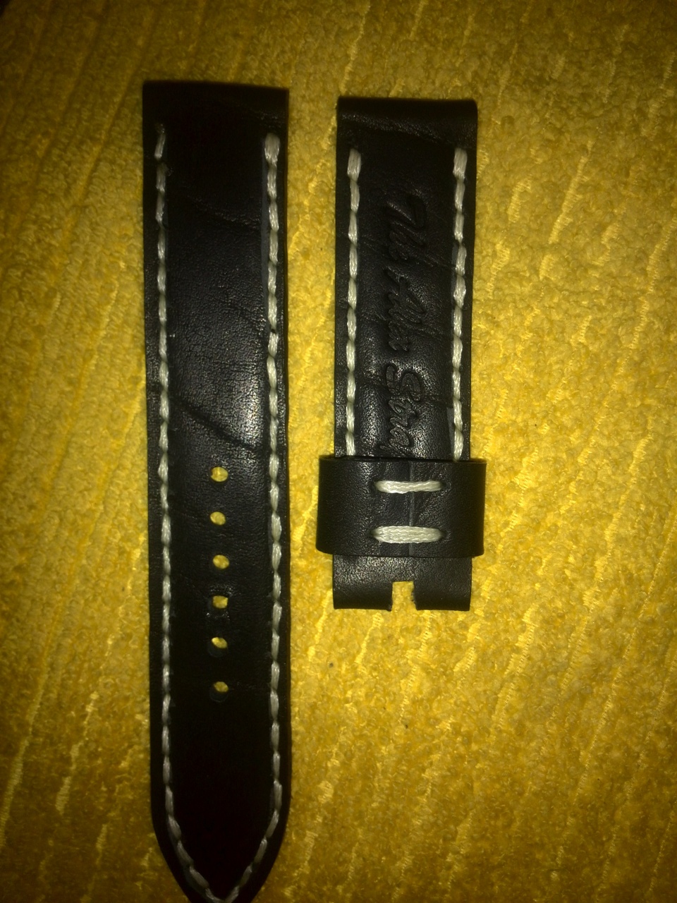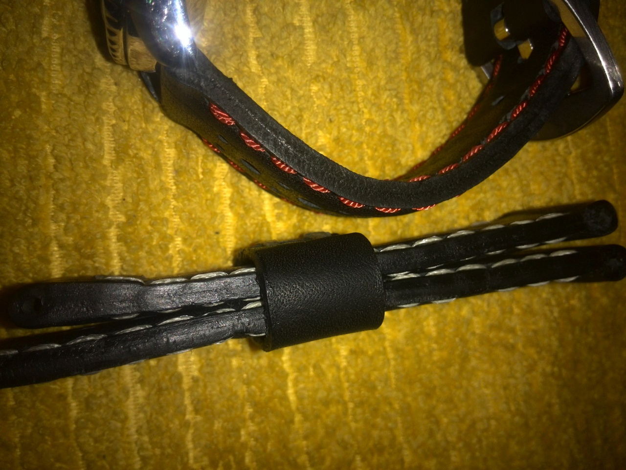 Уважаемые форумчане! Продаются 2 ремешка ручной работы на 22мм . Чёрный с красной прострочкой и перфорацией ТТХ 137 и 78мм толщина 3мм в средней части 4мм. Чёрный с белой прострочкой ТТХ 140 и 82мм толщина такая же. Прошиты капроном и вощёной нитью DAFNA . Ремешки плотные из хорошей кожи изготовлены и прошиты полностью вручную. Цена по 750р без бакли или 1000р с баклей. Любые вопросы в личку.