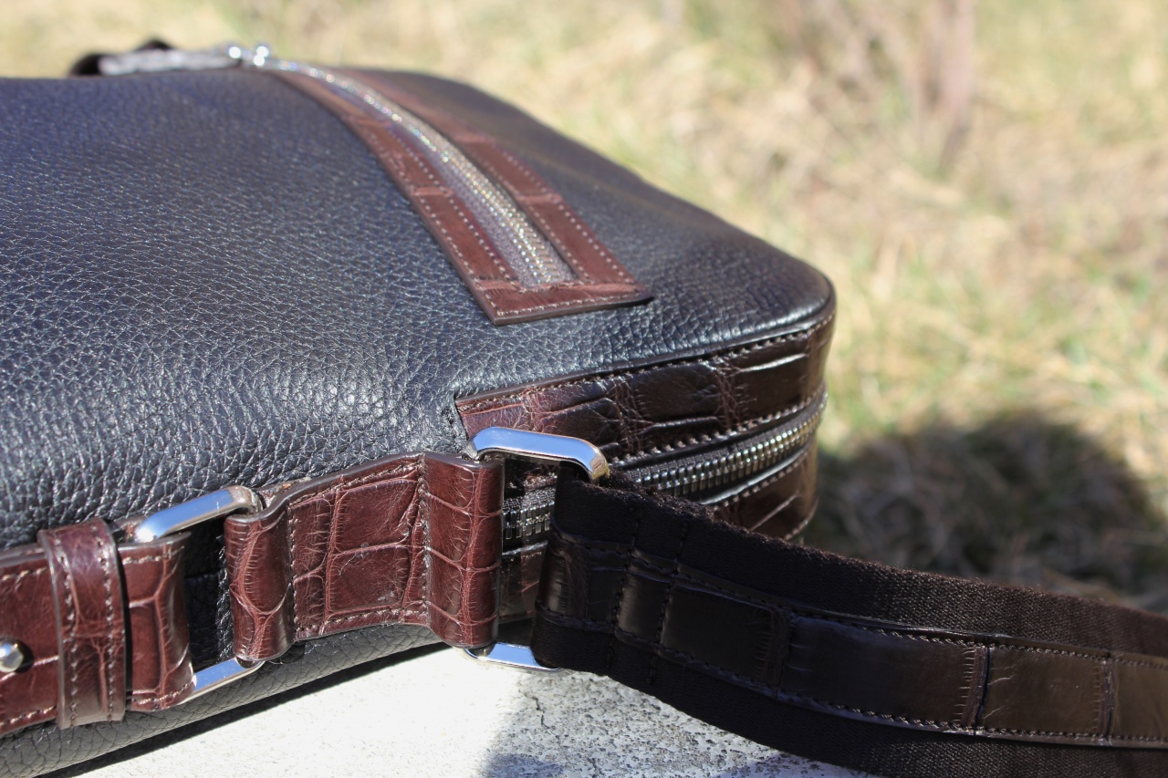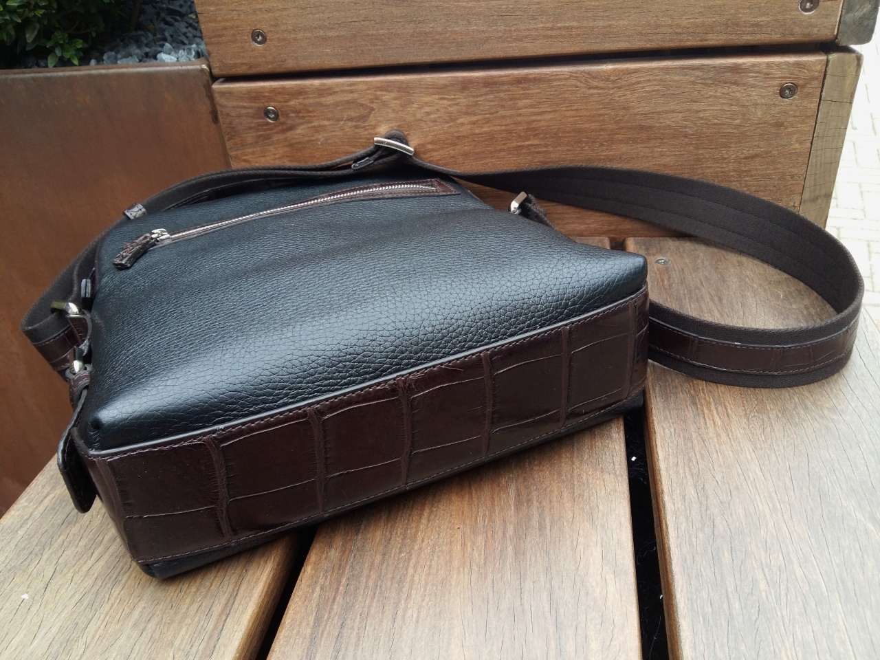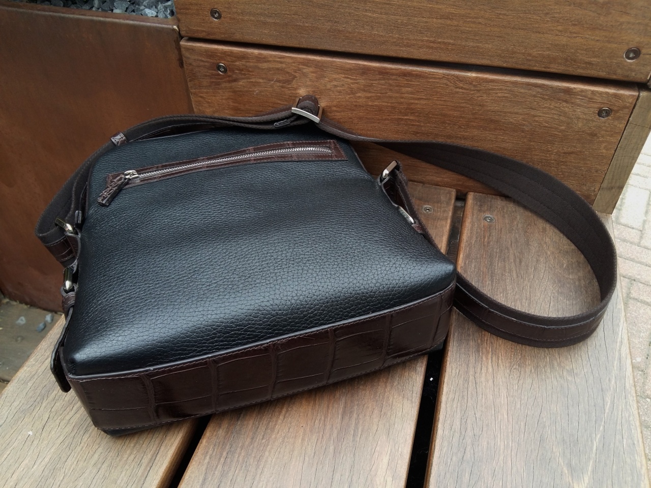 Сумка застегивается на металлические молнии с бегунками из кожи крокодила и имеет снаружи отделение для небольших документов.