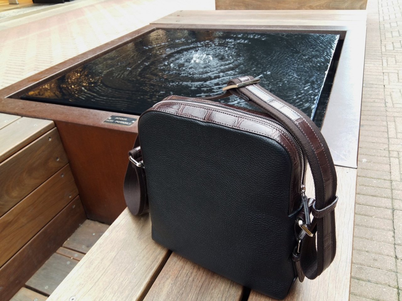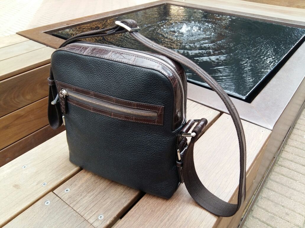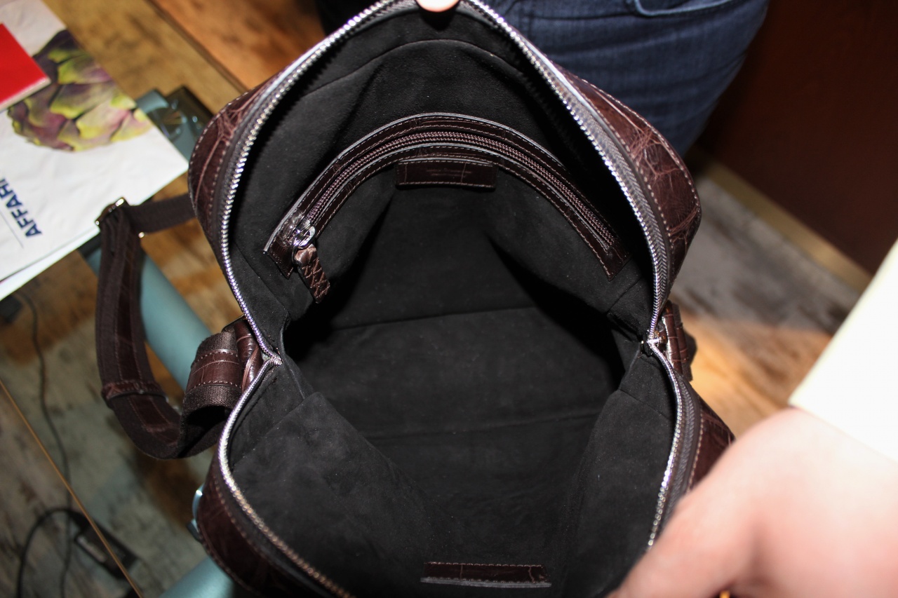 Сумка застегивается на металлические молнии с бегунками из кожи крокодила и имеет снаружи отделение для небольших документов.