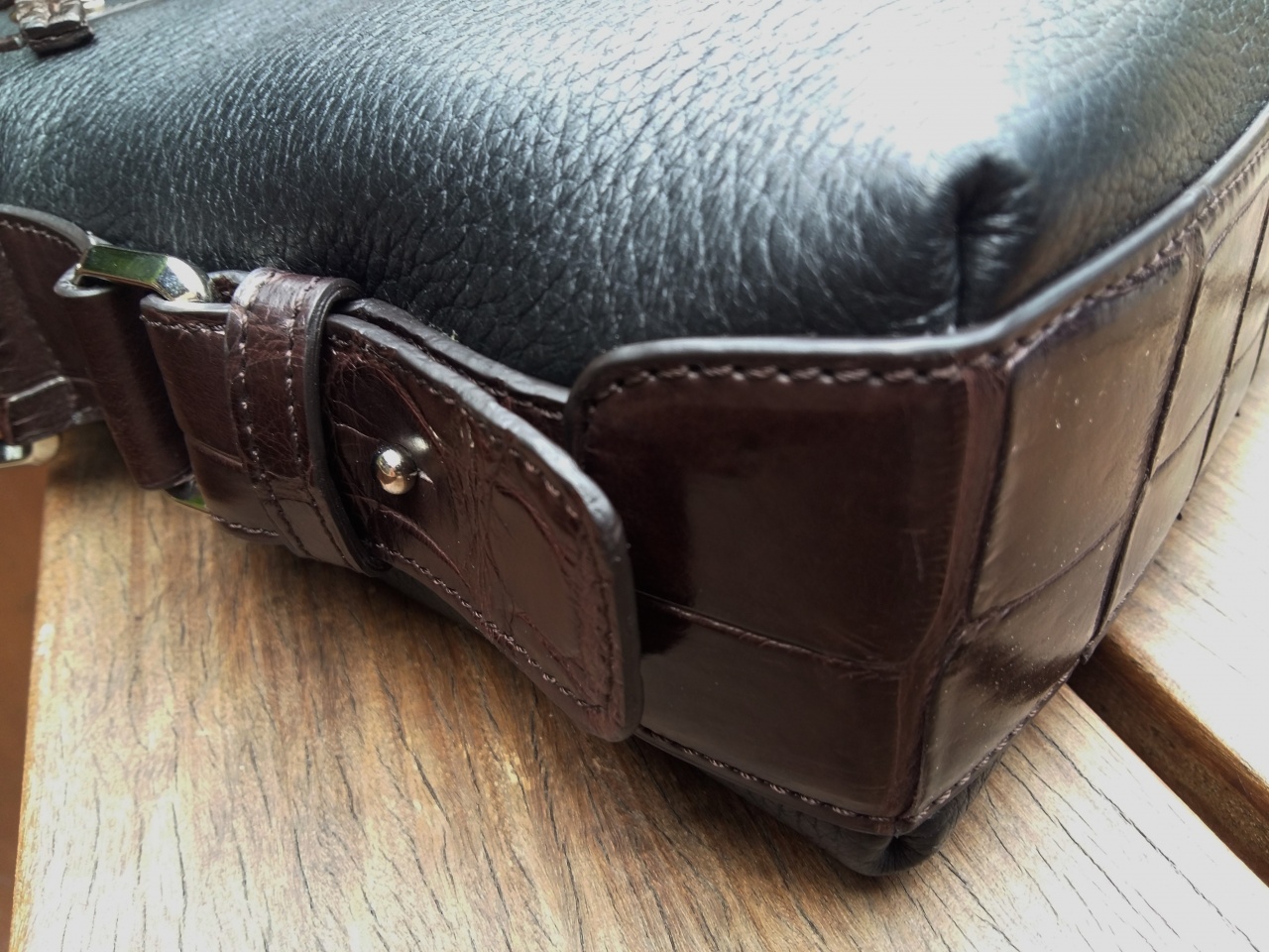 Изготовлена из 100% оленьей кожи высочайшего качества выделки чёрного цвета, детали и декоративные элементы сумки изготовлены из кожи нильского крокодила, окрашенного в тёмно-коричневый цвет, и металла, покрытого палладием.