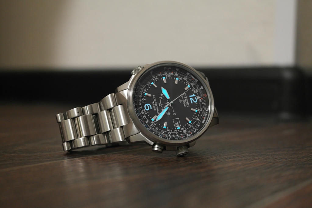 Точный кварцевый калибр H461. • Система ECO-DRIVE - патентованная технология CITIZEN заключающаяся в размещении фотоэлементов скрытых под циферблатом и постоянно подзаряжающих аккумулятор часов. Продолжительность работы после полной зарядки аккумулятора при последующем хранении в темноте - 12 месяцев. Система предупреждения о низком уровне заряда аккумулятора за 72 часа до критического уровня. • Точность хода не хуже -/+15 сек./в месяц. • Диапазон пригодных для использования температур -10...+60C. • Центральные часовая, минутная и секундная стрелки. • Функция автоматической коррекции времени согласно радиосигналам точного времени. • Функция отображения уровня принимаемых сигналов точного времени. • Возможность установки часового пояса отличного от времени источника сигнала. • Режим энергосбережения элементов питания: при длительном простое часов в темноте в течение недели вращение стрелок часов прекращается для меньшего расхода энергии аккумуляторов. Движение стрелок возобновляется при попадании света на световые зарядные элементы. Отсчет времени в режиме сна не прекращается. При пробуждении стрелки перемещаются для отображении текщего времени. • Система предупреждения о низком уровне заряда аккумулятора за 72 часа до критического уровня. • Продолжительность работы после полной зарядки аккумулятора при последующем хранении в темноте - 24 месяца (приблизительно, при включенной функции энергосбережения) или 6 месяцев (приблизительно, при выключенной функции энергосбережения). • Диаметр корпуса 44 мм. • Минеральное стекло устойчивое к возникновению царапин. • Светонакопительный состав на стрелках и маркерах часа. • Круговая логарифмическая линейка с поворотной шкалой на вращающемся кольце опаясывающем циферблат и управляемом вращающейся головкой и шкалой нанесенной на внешнем контуре циферблата для математических расчетов. • Корпус из высококачественного стального сплава 316L с высокими антикоррозийными свойствами. • Завинчивающаяся заводная головка. • Водозащита до 20 АТМ. • Литой браслет из нержавеющей стали. • Надежный браслетный замок с тройным сгибом.