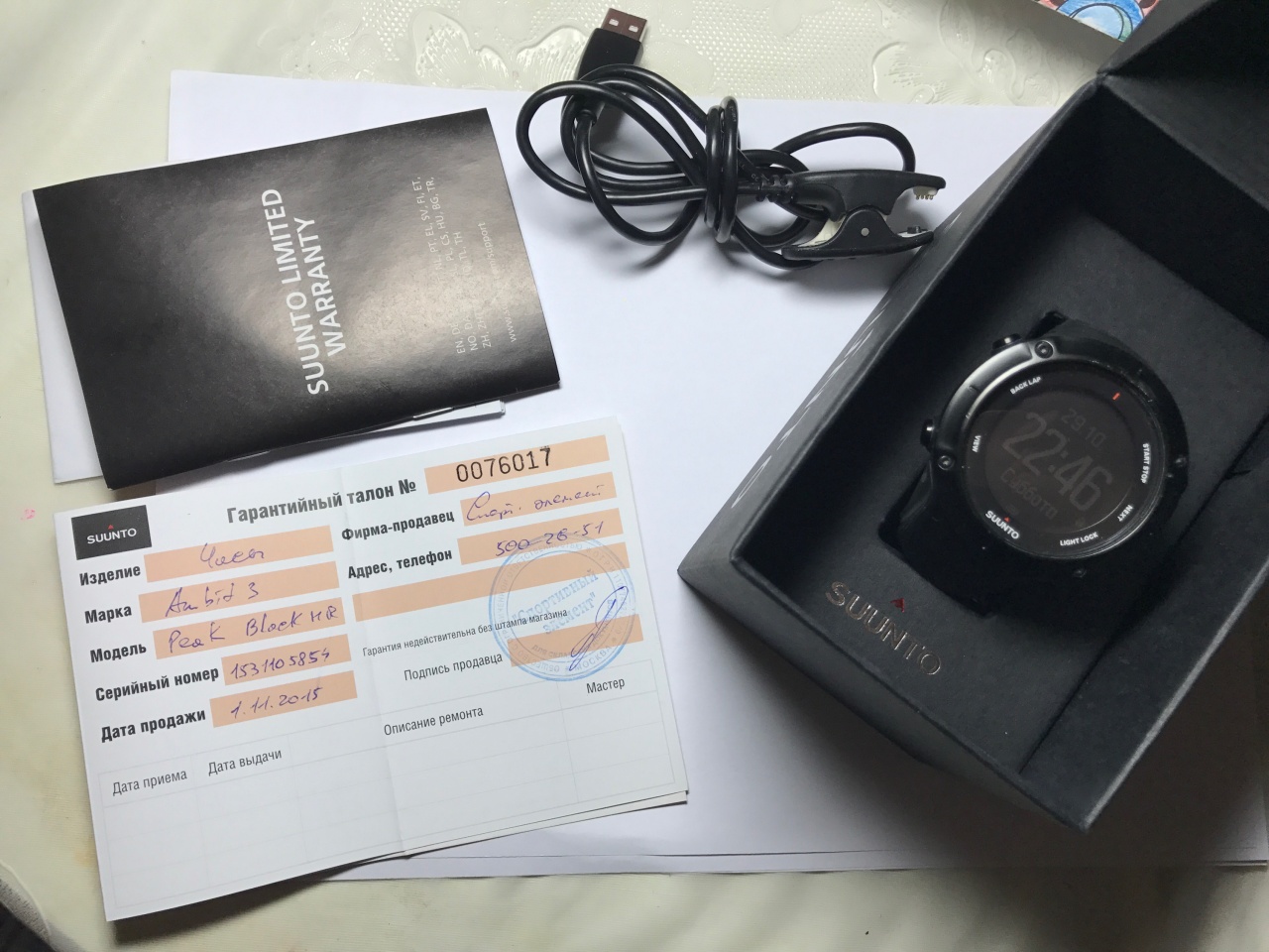Suunto Ambit3 Peak Black С КАРДИОДАТЧИКОМ, производство Финляндия. Часам год, на гарантии до 1.11.2017 г. Батарею держат без нареканий, GPS работает исправно до метра. Suunto Ambit3 Peak Black — часы для альпинистов, триатлонистов, бегунов, велосипедистов, пловцов и любителей тренажёрных залов. В разделе тренировок можно выбрать бег, велосипед, триатлон, тренировку в помещении, плавание на открытой воде или в бассейне. Водонепроницаемы на глубине до 100 метров и исправно работают в температурном диапазоне от -20 до +60.