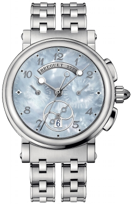 Хронограф линии Marine из качественной нержавеющей стали. Автоматический механизм с указателем даты и малой секундной стрелкой. 30-минутный и 12-часовой счетчики. Спираль из кремния. Циферблат из натурального перламутра с гильошированным вручную узором. Задняя крышка из сапфирового стекла. Водонепроницаемый до 5 бар (50 м). Разработка решений, направленных на преодоление негативного воздействия внешних магнитных полей в окружающей среде, открыла команде из отдела разработок Breguet совершенно новые перспективы. Применение кремниевых спиралей и анкерных колес, обладающих антимагнитными свойствами, а также изучение воздействия магнитных полей на часовой механизм открыли путь к применению магнитов внутри часового механизма с целью улучшения его рабочих характеристик. Первые результаты данных разработок были применены в механизме модели 7800 «La Musicale» с функцией боя, ставшей первыми в истории часами с магнитным регулятором. Изготовление наручных часов с музыкальным механизмом, в который встроен регулятор, обеспечивающий равномерность ритма, уже само по себе является настоящим техническим свершением. Более того, часовщики Мануфактуры не только смогли ликвидировать недостатки классических регуляторов, действие которых основано на трении, но и сконструировали инновационную систему с магнитами, в которой используются вихревые токи (токи Фуко). Таким образом, магнитный регулятор решает проблемы износа деталей, посторонних шумов и потребности в большом количестве энергии, обеспечивая при этом повышенную точность часов.