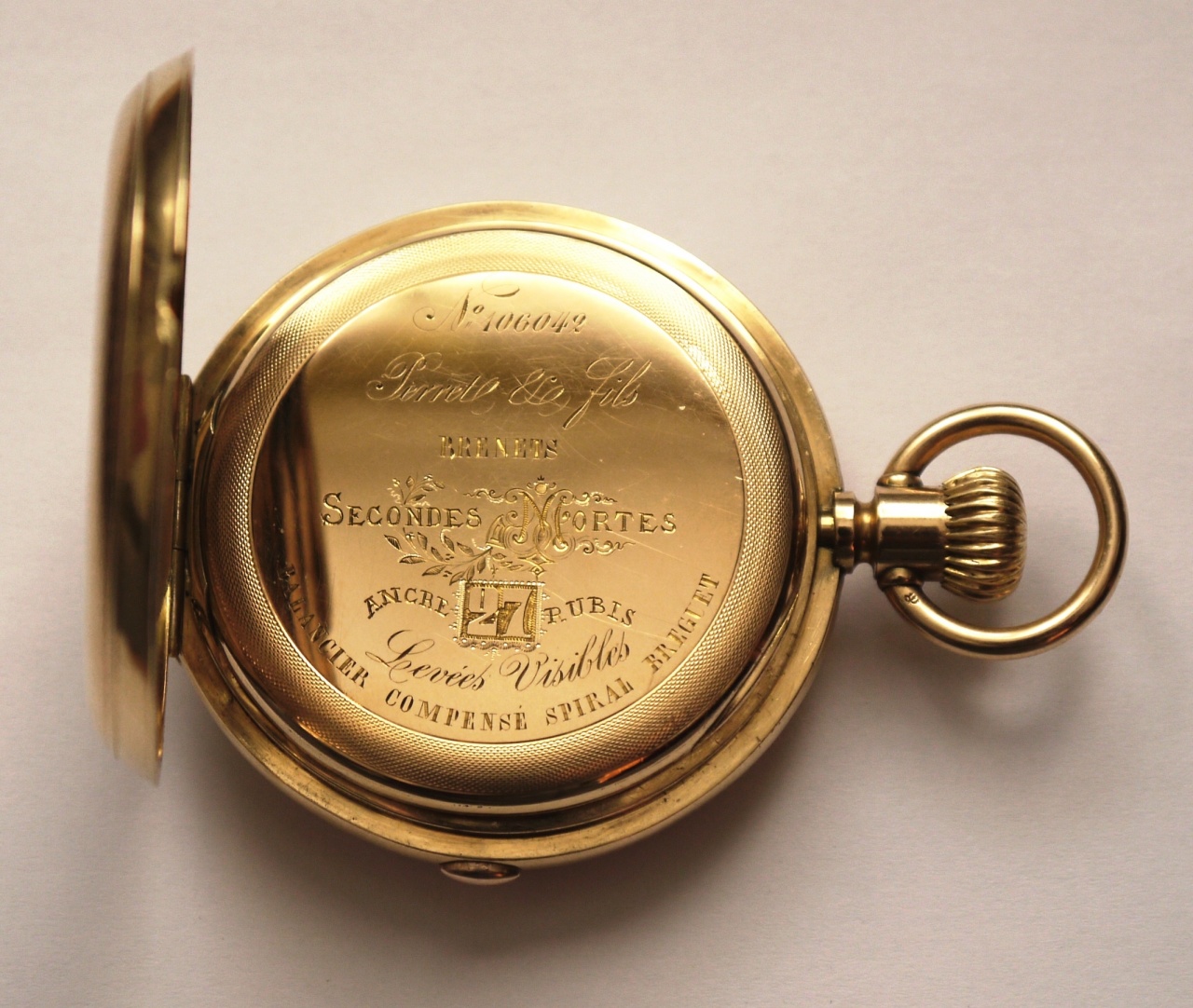 Диаметр 54 мм. Примерно 1860 -70 годы. "Медицинские".Независимая прыгающая секунда. Завод секунды и хода часов одной головкой. Кнопка остановки и пуска на 12ч. Жёлтое золото 14 к. Механизм Jurgensen. Обслужены.Корпус без вмятин.Циферблат без проблем.