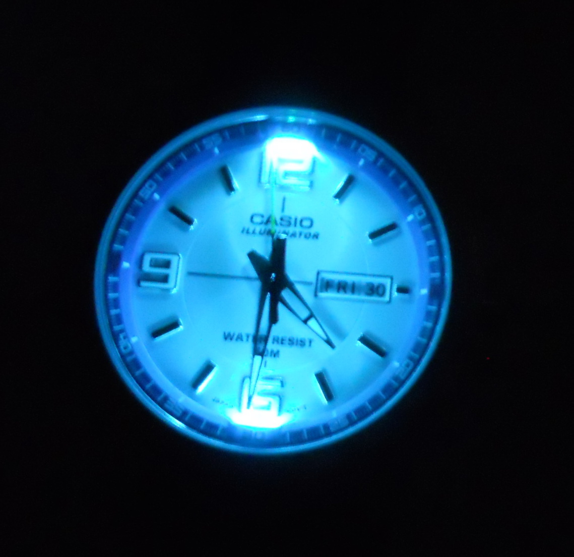 Доброго времени уважаемым форумчанам! Краткая прелюдия: В юности ни одни часы не выживали на руке более месяца, при полном отсутствии экстрима. Попытки носить часы были оставлены на почти на двадцать лет.. Но шли годы, жизнь изменилась и стабилизировалась, невзирая на всякие кризисы, в результате явился и дом за городом, и любимая дражайшая половина, - так спокойно и без стрессов протекает год за годом, что логически предвещает тягу к излишествам, к которым раньше причислял и часы на руке. И вот, в пику эпохе победившего гламура и айфонов, выбросив из дома без сожаления телевизор и раздав тачскрины, по недоразумению именуемые "современными телефонами", решил таки приобщиться к вечному. В результате вдумчивого курения форума на словосочетание "швейцарские часы" выработался стойкий негатив, особенно к Инвикте, Тиссо и Роликам. Японцы как-то честнее, что-ли. Возможный максимум часов за возможный минимум оплаты без ненужного довеска истории приобщения к "илите". Вот собственно, почему именно Касио. А далее выявилась тяга именно к МТП-шной серии, как наиболее разнообразной. Эдифайсы оставим на туманное будущее, так сказать на развитие ЧБ.. Требовалось нечто простое, бюджетное, надёжное и не мрачное, на повседневку, под джинсу и запястье 18см, с какой-то одной "фишкой" и не затасканное народом, - вот почему именно кварц и MTP-E202-2A. Цена плавает в интернете, но благо у Ирины их можно взять по наиболее вкусной цене, а учитывая, что до её надёжности и аэрофлоту еще пахать и пахать, для новичков, шарахающихся от и-бей и амазона, самое то. И так, что имеем, а потом вопросы: WR50, 45мм, 81грамм, трёхстрелочники, батарея трёхлетка. Светлый цифер с синим ободком, ручная дата с днём недели, цифры в металлических ободках, люм в цифрах и стрелках, ремешок типа "кордуры", или как здесь принято называть "стандарт нато" и как фишка - трёхсекундная двухдиодная подсветка,- на тёмных циферах она смотрится темнее. Вопросы остались к материалу корпуса, на разных сайтах по разному, но склонен думать, что всё-же латунь с покрытием. Кроме того, по механизму подозреваю, что Мийота, и это уже было-бы хорошо. На некоторых фото в интернете цифер выглядит молочно-белым, но это не так, - он скорее серебристо-белый с серым отливом. Электроподсветка выглядит интереснее, чем сплошная у Таймексов, пообъёмнее, "поламповее", сермяжный ремешок, надеюсь, будет неприхотливее, чем кожа. Стрелка секундная в риски попадает, - а что ещё нужно, страждущему в поиске бюджетных Касио? И несколько фото на мыльницу Будённого: