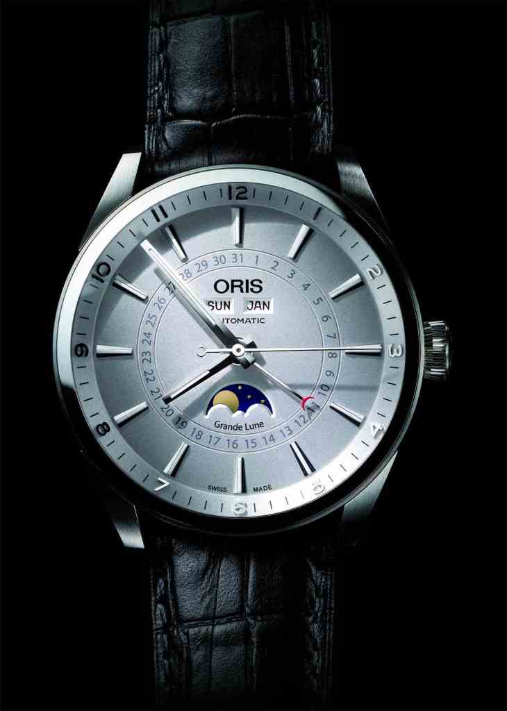 Новая модель Artix Complication (Ref. 915 7643 4051 LS/MB) от швейцарской часовой компании Oris имеет круглый многокомпонентный корпус, изготовленный из нержавеющей стали, диаметром 42,0 мм, водонепроницаемый до 100 метров. На торце рифленой заводной головки, расположенной на 3 часах, выгравировано наименование бренда Oris. На передней стороне часового корпуса установлено выпуклое сапфировое стекло с внутренним антибликовым покрытием, а на его завинчивающейся задней крышке - минеральное стекло. На серебряном двухуровневом циферблате имеются накладные продолговатые часовые индексы, покрытые, как и часовая и минутная стрелки, люминесцентным составом SuperLumiNova белого цвета. На фланце циферблата размещены накладные арабские цифры. Секундная стрелка имеет на противовесе объемный логотип бренда - букву "O". Модель оснащена швейцарским автоматическим механизмом Oris 915 (базовый калибр Sellita SW200-1 с модулем Dubois Dupraz DD9000), с функциями индикации часов, минут, секунд (посредством соответствующих центральных стрелок), даты (на соответствующей круглой шкале, размеченной арабскими цифрами, посредством специальной короткой центральной стрелки с наконечником в виде красного полумесяца), дня недели (посредством соответствующего буквенного указателя в апертуре, расположенной на 11 часах), месяца (посредством соответствующего буквенного указателя в апертуре, расположенной на 13 часах) и фаз Луны (посредством соответствующего указателя в апертуре, расположенной на 6 часах).