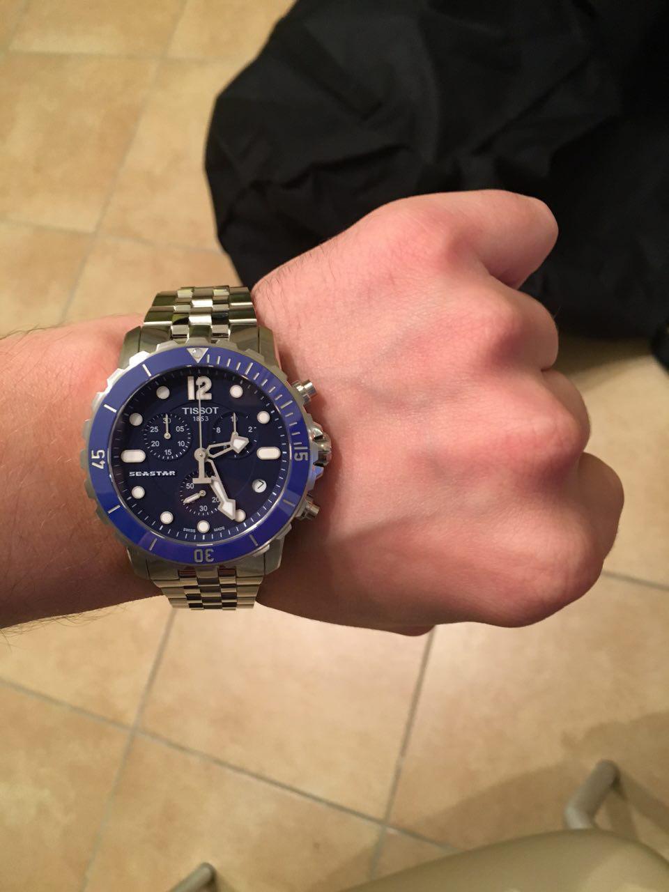 Кварцевый хронограф. Механизм ETA G10.211 (на 4 камнях). Секундная стрелка смещена на маленький циферблат (в 6 часов). Дополнительные циферблаты хронографа: на 30 минут и 1/10 доли секунд. Секундомер с режимами ADD и SPLIT. Окошко даты. Срок службы батареи 38 месяцев. • Корпус из высококачественной нержавеющей стали со стойким PVD покрытием. Диаметр корпуса 45 мм,толщина 13,3 мм. Вес 190г. • Сапфировое стекло устойчивое к царапанию. • Регулируемый по длине браслет из нержавеющей стали. • Водозащита до 3 АТМ.