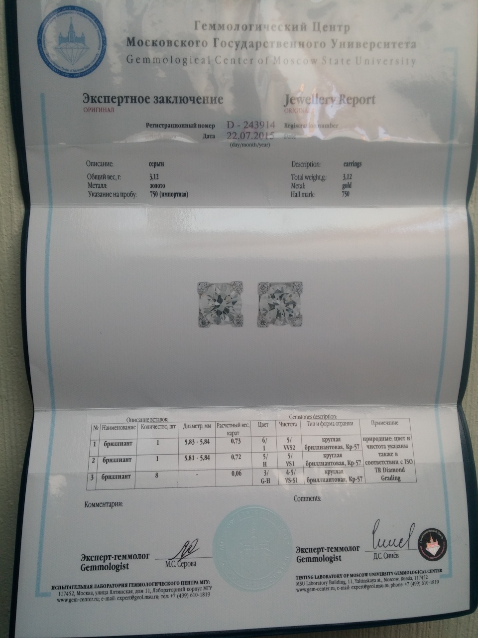 Серьги-пуссеты из белого золота с бриллиантами 1,45 карат (сертификат МГУ)