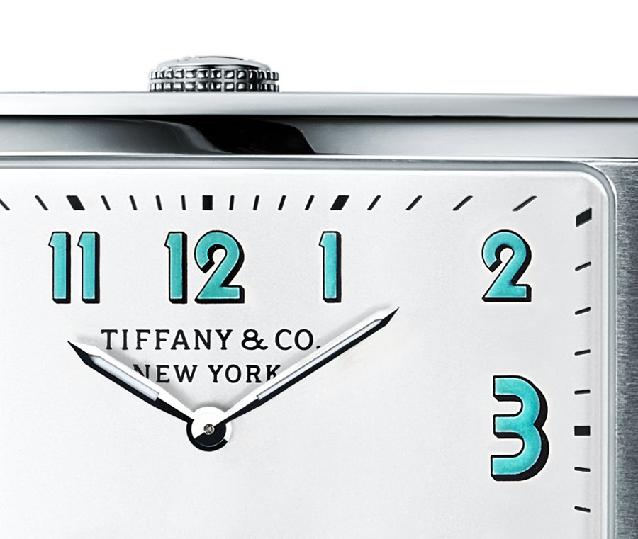 Первая из них, Tiffany East West with Tiffany Blue SuperLumiNova (Ref. 37447102), имеет изогнутый прямоугольный полированный корпус, изготовленный из нержавеющей стали, длиной 42,0 мм, шириной 25,0 мм, водонепроницаемый до 30 метров. На торце рифленой заводной головки, расположенной на 3 часах и "притопленной" в корпус, выгравирован логотип бренда Tiffany. Сапфировое стекло установлено на передней стороне часового корпуса (изогнутое, с антибликовым покрытием) и на его задней завинчивающейся крышке. Циферблат белого цвета с арабскими цифрами, покрытыми люминесцентным составом SuperLuminova голубого цвета (Tiffany Blue colour). Сам циферблат расположен горизонтально (повернут на 90 градусов по часовой стрелке по сравнению с его обычным расположением), что по мнению производителя облегчает считывание показателей времени, особенно при вождении автомобиля и при печатании. Модель оснащена кварцевым механизмом с функциями индикации часов и минут (посредством соответствующих центральных стрелок). Поставляется на черном ремешке из кожи аллигатора с застежкой из нержавеющей стали. Цена модели составляет $ 3750.