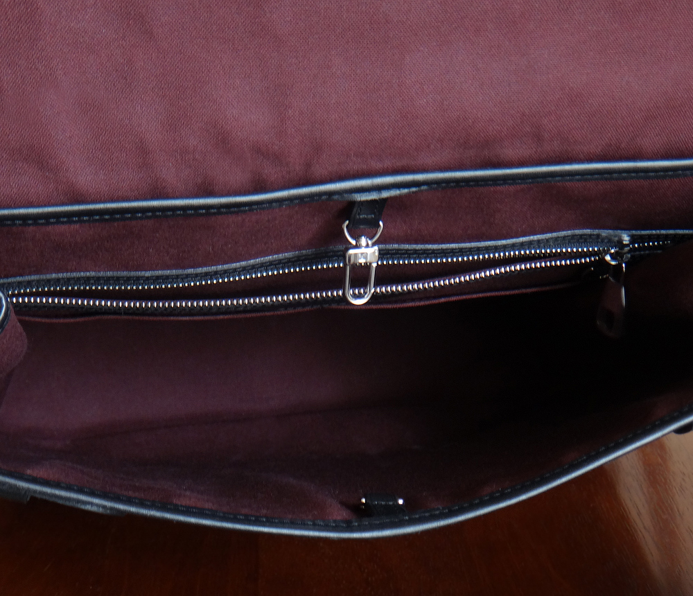Сумка закрывается на широкий клапан со скрытыми магнитными застежками и дополнительно на карабин внутри.