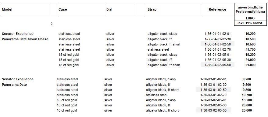 А новая модель с луной, Senator Excellence Panorama Date Moon Phase, в евро выходит € 10.300. Старая модель Senator Panorama Date Moon Phase стоит € 9.800. Итого всего 500 евро разницы.