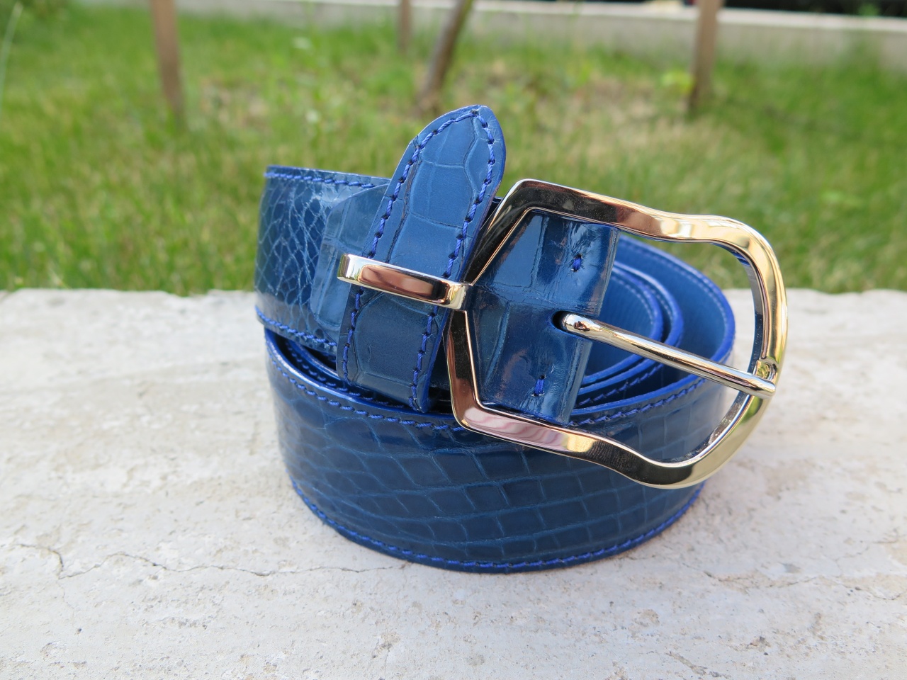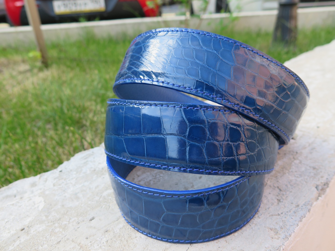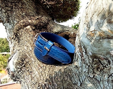 Яркий мужской ремень на лето из кожи аллигатора,цвет Королевский синий.