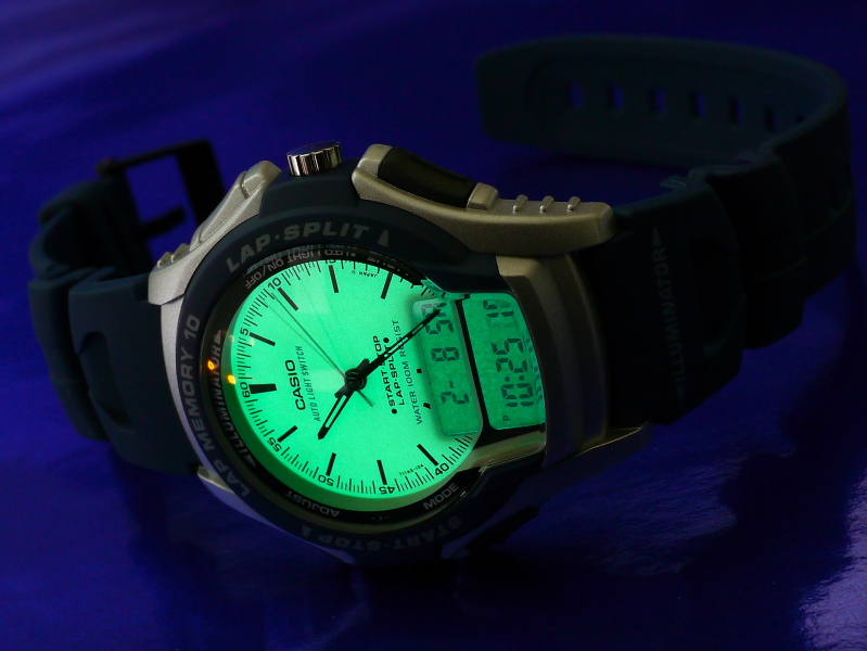 Подсветка похожа на INDIGLO от таймекса, светится зеленым цветом весь экран. Но если если у таймекса, по крайней мере у той модели с которой я сравниваю и которая будет на фотках, подсвечивается и экран, то на этих подсвечивается только циферблат, в темноте на экране увидеть не получится вообще ничего. Подсветка работает только пока держишь кнопку, после отпускания кнопки погасает сразу.