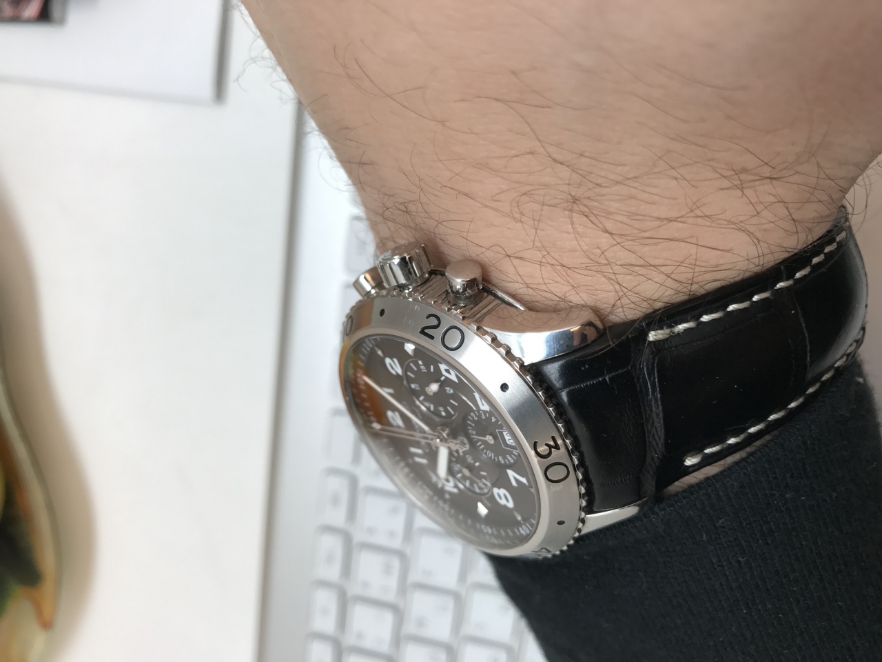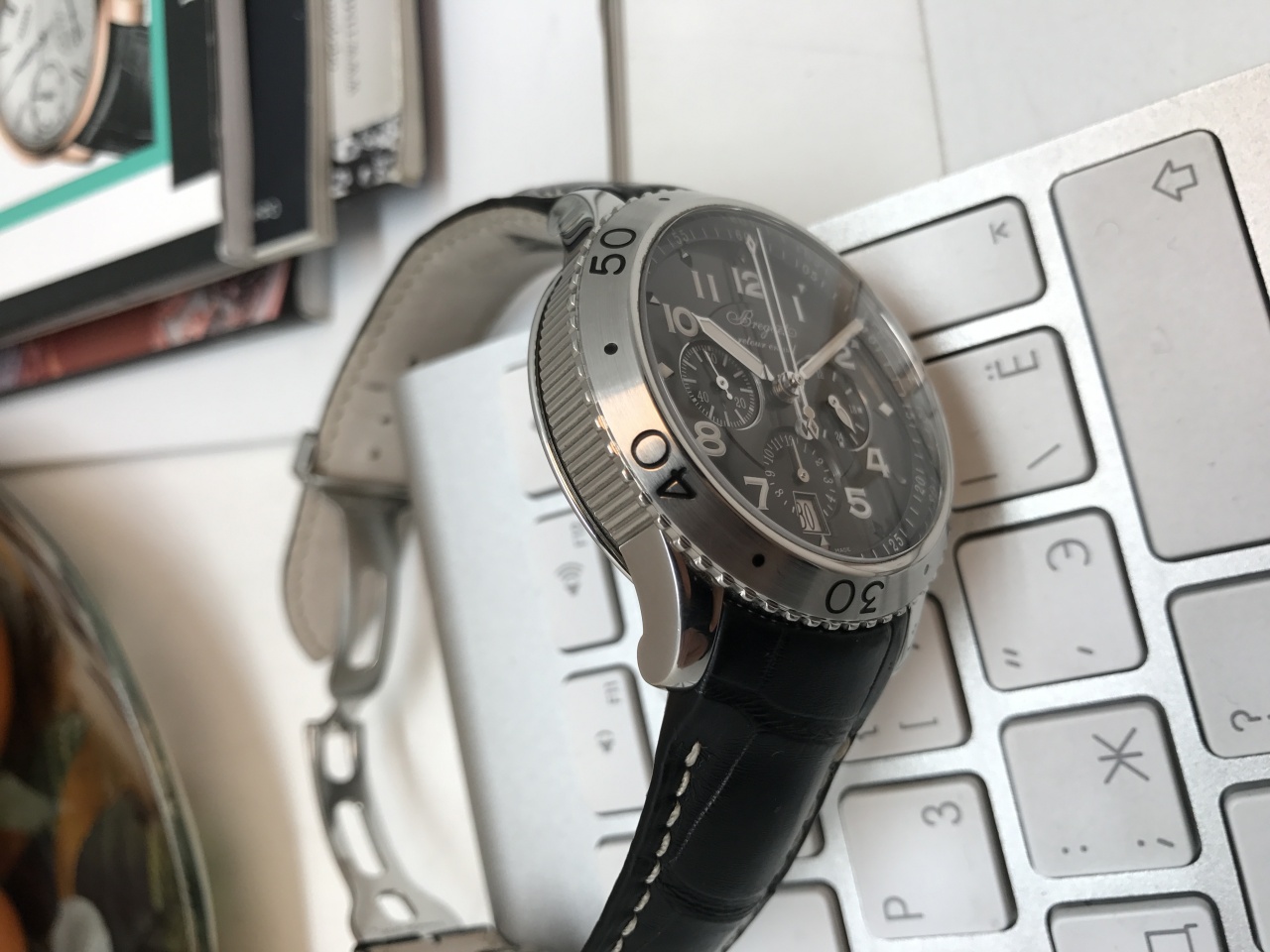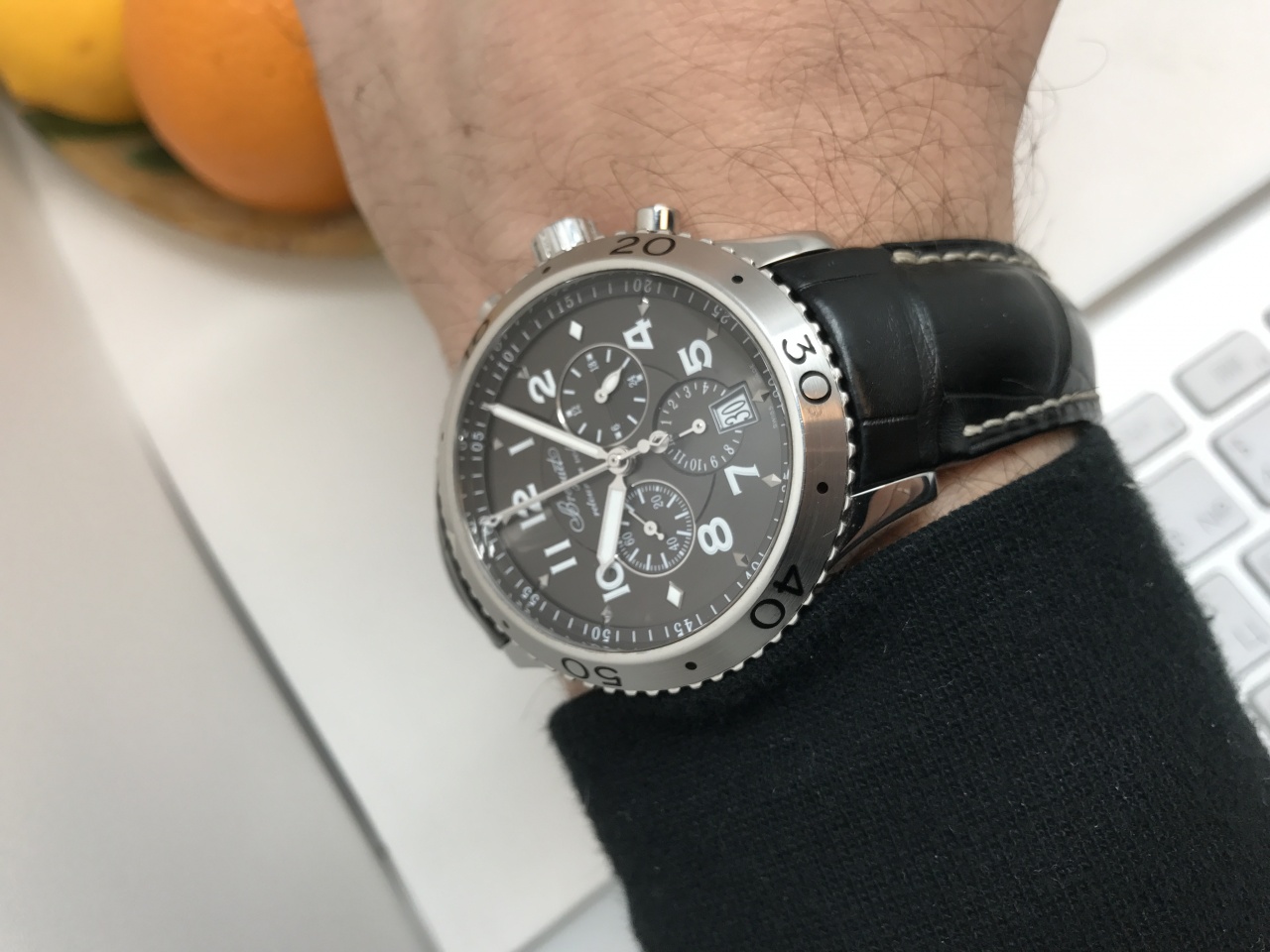 Мужские наручные часы Breguet Type XXI Flyback Chronograph 3810 - это сверхточный хронограф в стальном корпусе размером 42 мм. Часы с функцией fly-back снабжены автоматическим механизмом 584Q с запасом хода 48 часов, указателем даты и малой секундной стрелкой. Окошко даты расположено в положении «6 часов». Хронограф имеет градуированный вращающийся безель и завинчивающуюся заводную головку. Стрелки и цифры на циферблате покрыты люминесцентной краской. Водонепроницаемость корпуса до 100 метров. Черный цвет циферблата сочетается с ремешком из кожи аллигатора со стальной раскладывающейся застежкой.