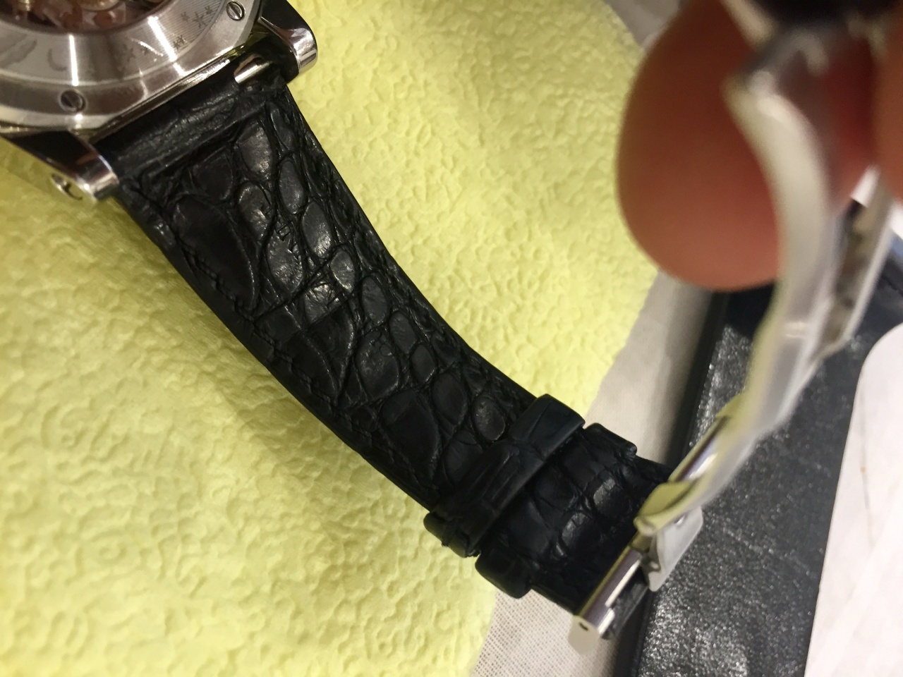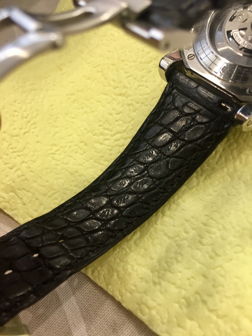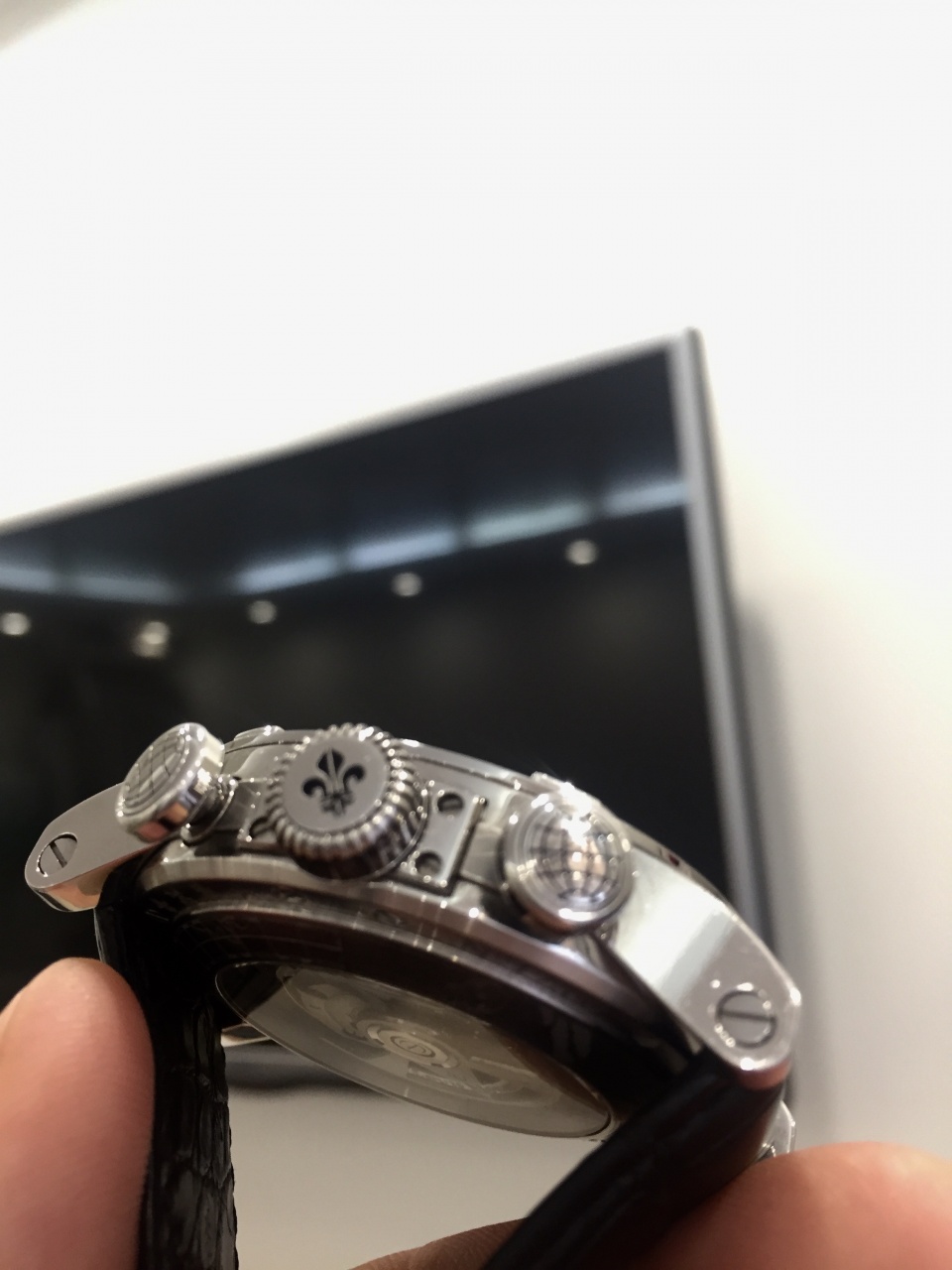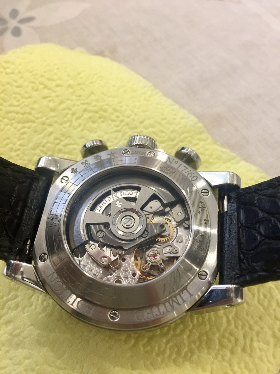 Ремешок выполнен из кожи аллигатора с раскладной застежкой из нержавеющей стали. Выпуск часов ограничен 60 экземплярами.