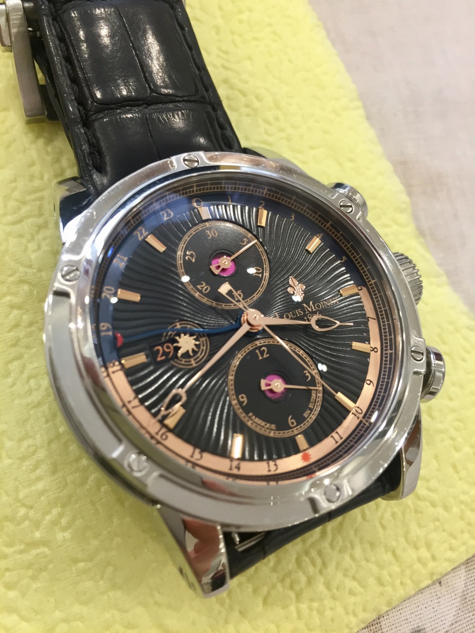 На черном гильошированном циферблате золотые индексы, стрелки из розового золота 18 карат, часовой, минутный и секундный счетчики хронографа на 6, 12 и 9 часах соответственно, апертура даты на 9 часах и 24-часовая шкала для второй часовой зоны.