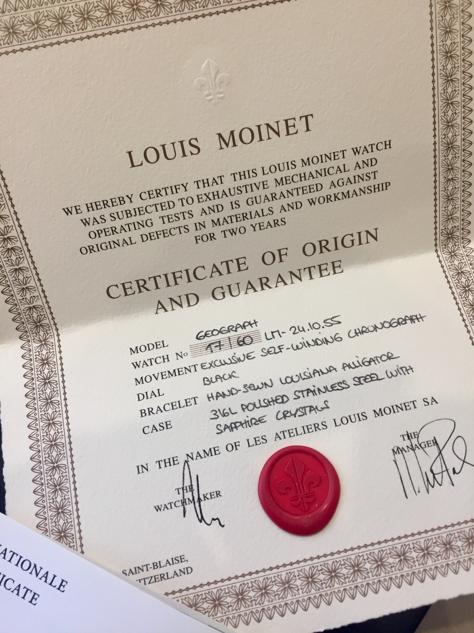 Водостойкость в 50 метров. Механизм с автоподзаводом был полностью задуман и разработан компанией LOUIS MOINET состоящий на 25 рубинах, с балансовой частотой 28800 пол/час. Запас хода составляет 48 часов.