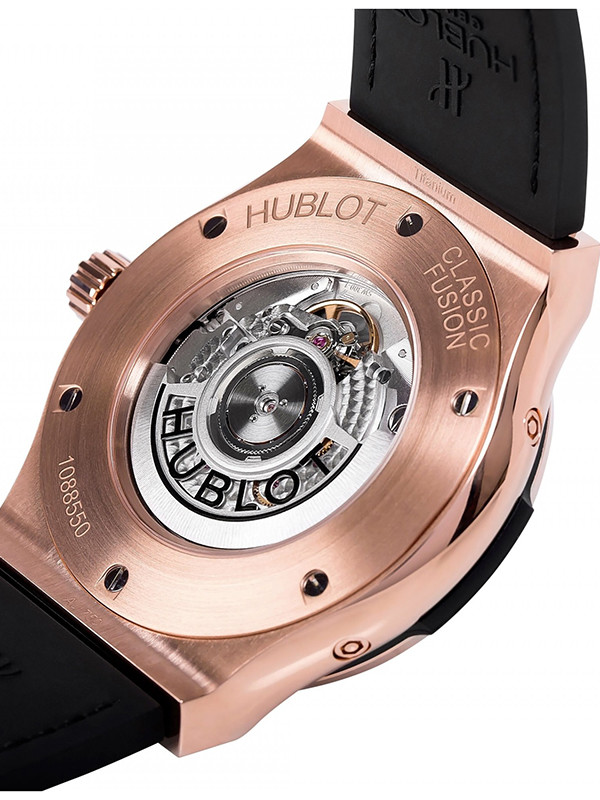 Материал корпуса: Розовое золото 18 карат; Размер корпуса: 45 мм; Тип механизма: Механический с автоподзаводом; Калибр: HUB1131; Запас хода: 42 часа, Функции: часы, минуты, секунды, дата, месяц, день недели, фаза луны; Водонепроницаемость: 50 м; Браслет: Ремешок из кожи аллигатора и каучука; Цвет ремешка: Черный