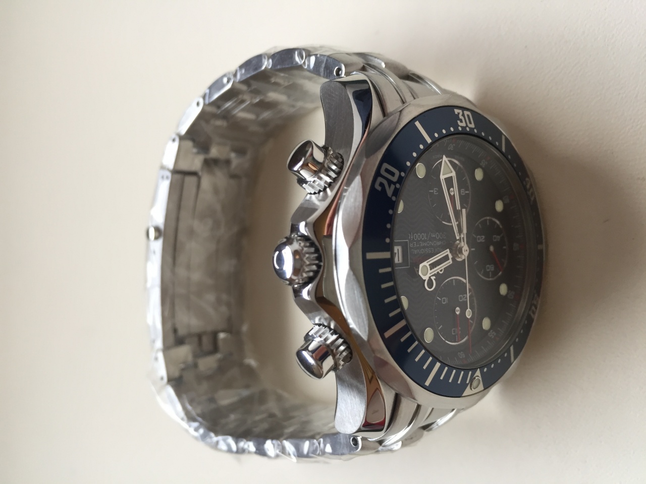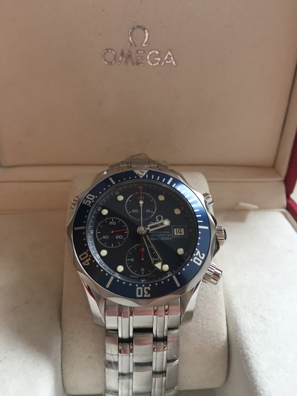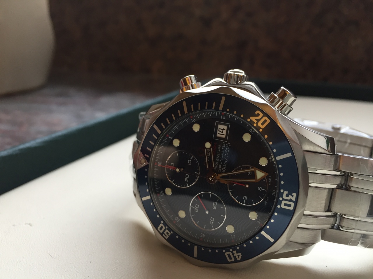 Данная модель OMEGA Seamaster Diver 300M Chronograph имеет лакированный синий циферблат с 30-минутным счетчиком в положении «3 часа», 12-часовым счетчиком в положении «6 часов» и малой секундной стрелкой в положении «9 часов». Вращающийся в одном направлении безель из полированной синей керамики закреплен на корпусе диаметром 41,5 мм из нержавеющей стали с гелиевым клапаном и интегрированным корректором даты в положении «10 часов».