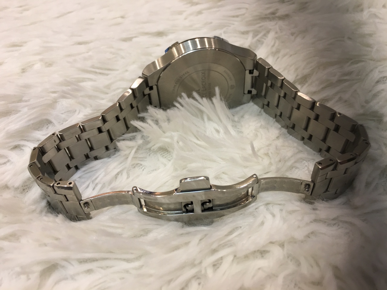 - Двойная раскладывающаяся застежка с кнопками, сатинированная и полированная отделка, круговое зернение