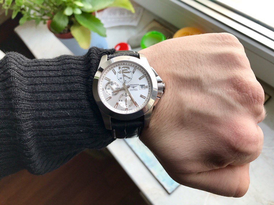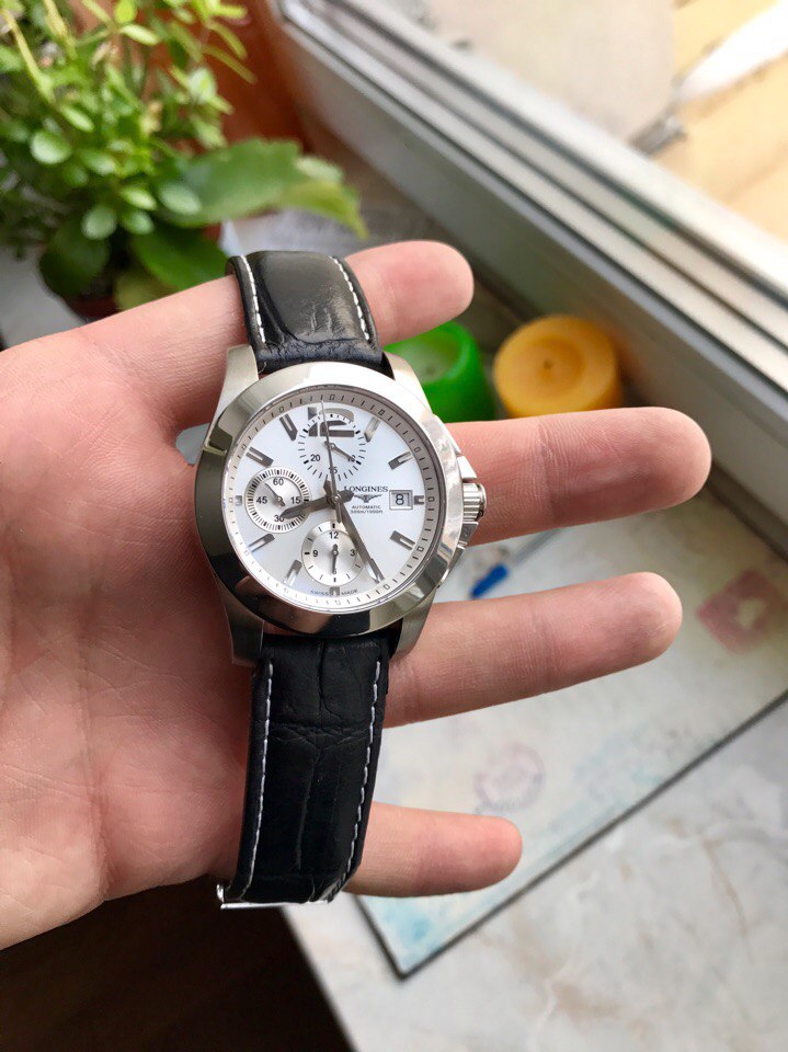 Механический хронограф от одной из самых известных часовых компаний мира. Состояние прекрасное. Сколов, царапин, потертостей нет. Носились бережно и не часто. Механизм обслужен и на идеальном ходу (-1 сек/сут.), амплитуда и герметичность в норме, перед продажей выполнена профилактика (чистка, смазка). Соответственно, никаких вложений часы не требуют. В комплекте коробка и карта с печатью дилера. Ремешок не родной, застежка родная. Ширина ушек стандартна и универсальна, 22мм, можно посадить на стальной браслет, каучук или другой кожаный при желании.