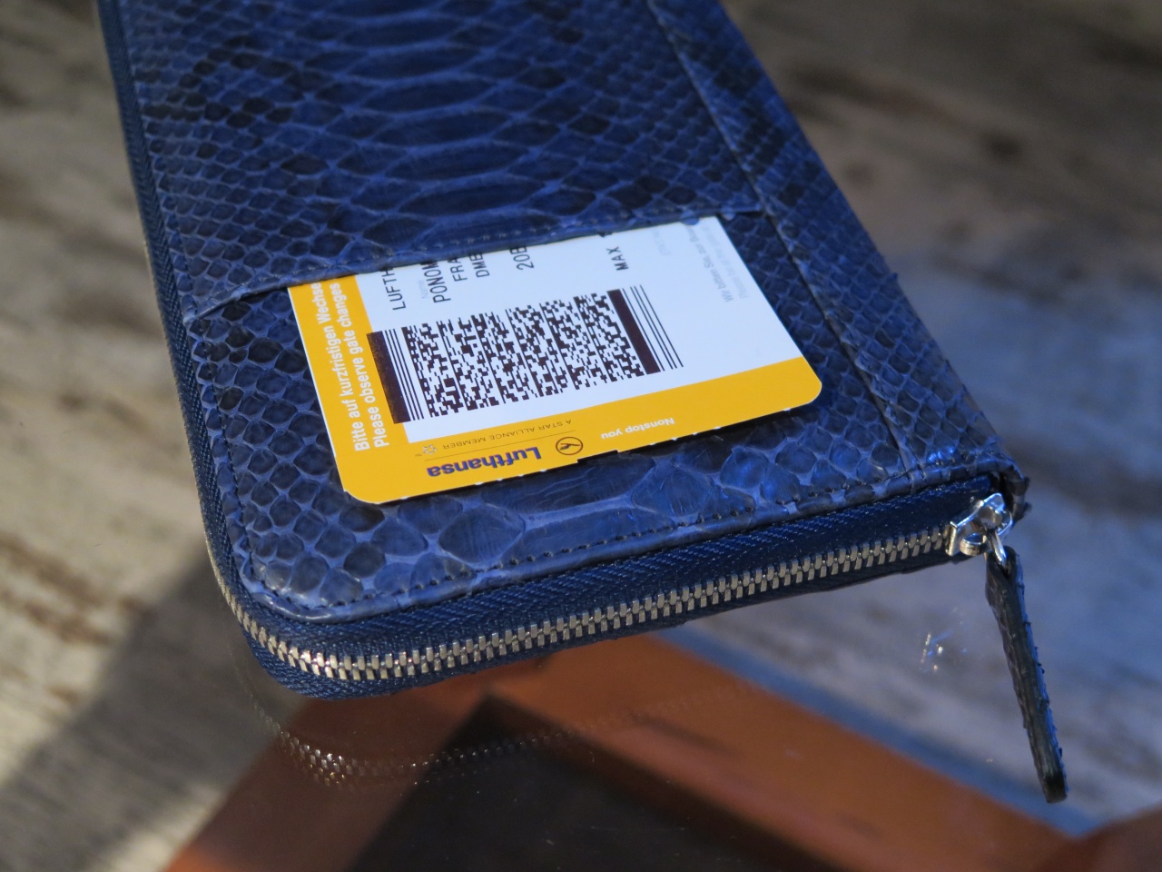 Клатч застегивается на молнию и имеет два больших отделений для банкнот, восемь отделений для кредитных карт или визиток, отделение для паспорта, авиабилета, водительских прав, отделение "под котлету" и других документов.