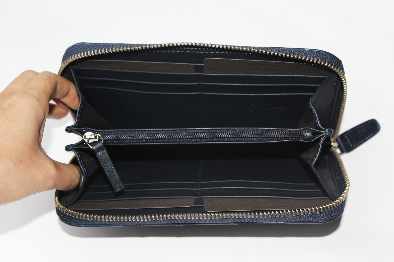 Клатч застёгивается на позолоченную молнию с бегунком из кожи страуса, и имеет внутри два больших отделения для банкнот (евро, доллары, рубли) с тесненным изображением логотипа марки "Briаnzа", 12 отделений для кредитных карт или визиток, два отделения для паспорта, водительских прав или иных документов, и центральное отделение для монет, застёгивающееся на молнию.