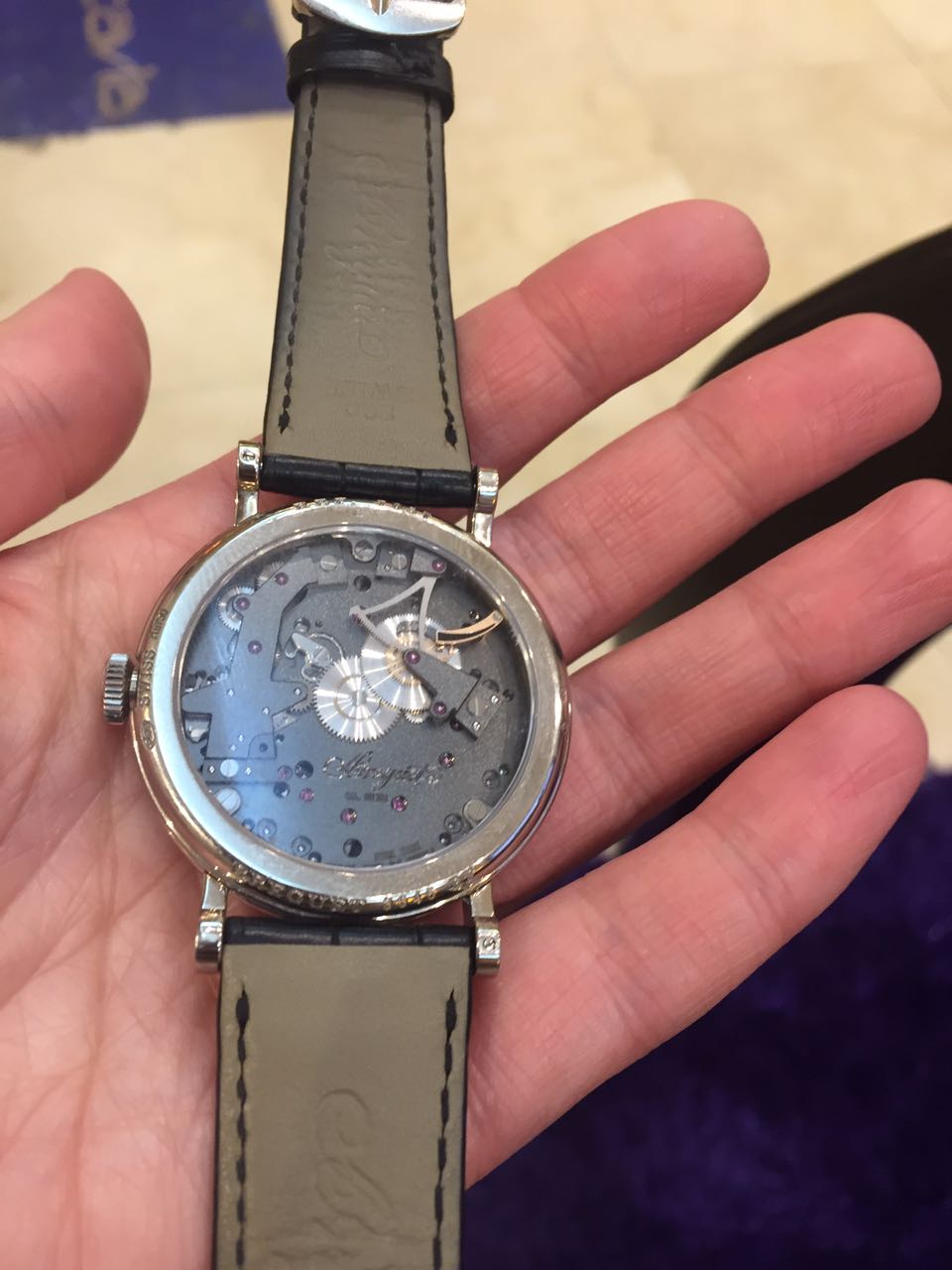 Данная модель-скелетон выполнена в белом золоте - потрясающее сочетание невесомых деталей и притягательно-мягкого серебристого отлива. Серый циферблат с выделяющимися подвижными деталями привлекает внимание и завораживает.