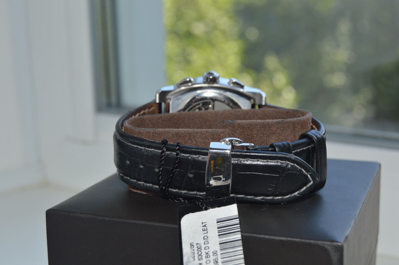 Стекло сапфировое с антибликом, черный циферблат, ремешок из натуральной кожи.
