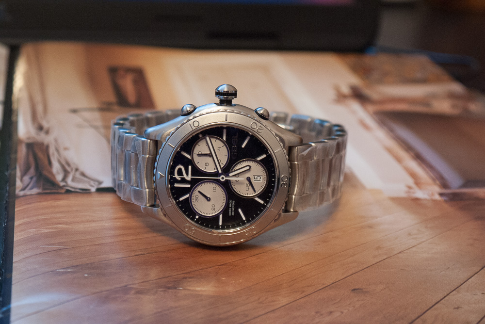Индикация даты в позиции 6 часов совмещена с секундной стрелкой на нижнем дополнительном циферблате