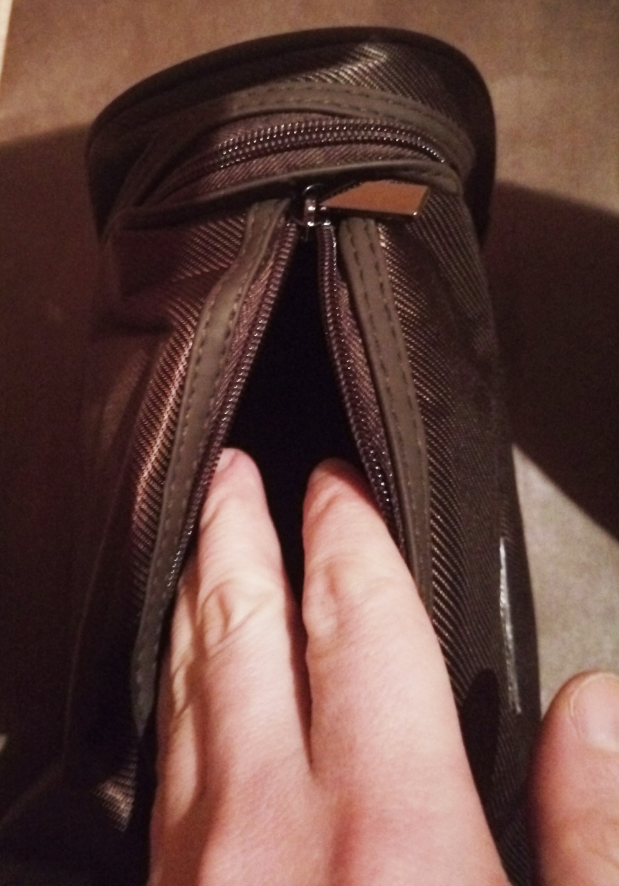 Оригинал, вшитые ярлыки. Представляет из себя косметичку из плотной ткани, коричневого цвета. По центру сумки металлическая планка с логотипом (планка в заводской пленке), на торце есть ручка, сумка закрывается на замок, также имеет удобный боковой карман для мелочевки на молнии.