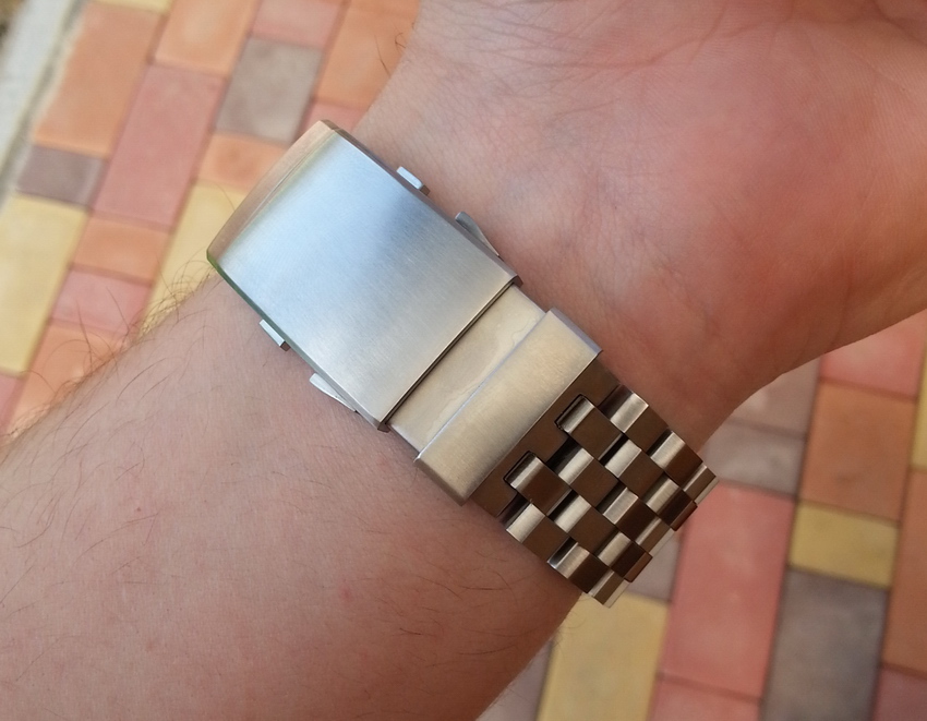 Высота звеньев примерно 4.5мм, ширина 22мм. Застежка литая, металл толстый, оставляет впечатление надежности. Очень хорошо и четко работает удлинитель - легко регулируется одной рукой не снимая часов.
