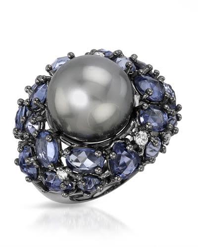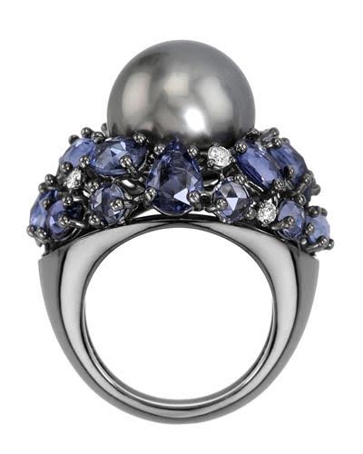Кольцо UTOPIA коллекция CONCERTO с черной жемчужиной и синими сапфирами.